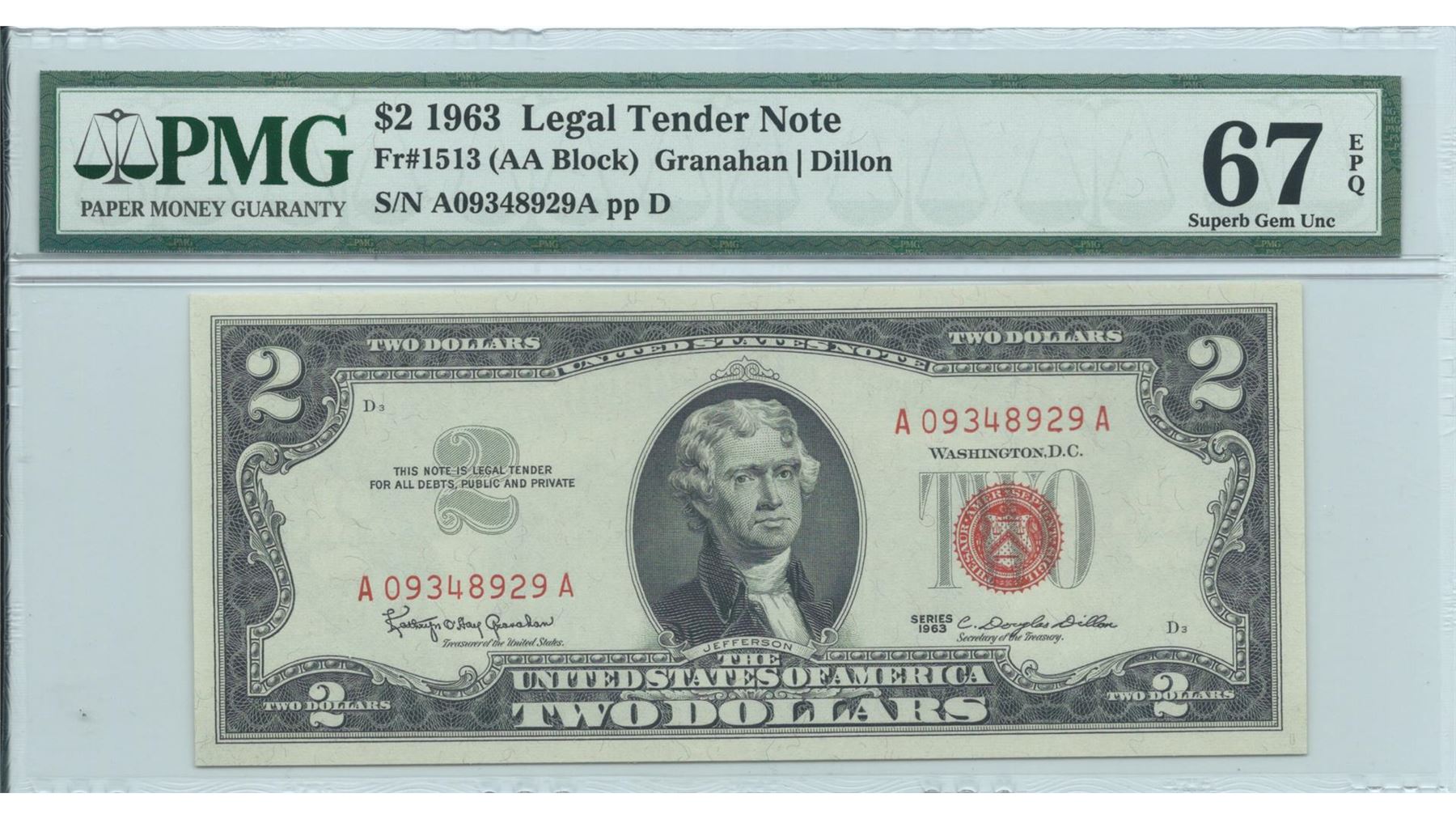 One 1963 PMG SGU 67EPQ $2 Legal Tender Bank Note.
