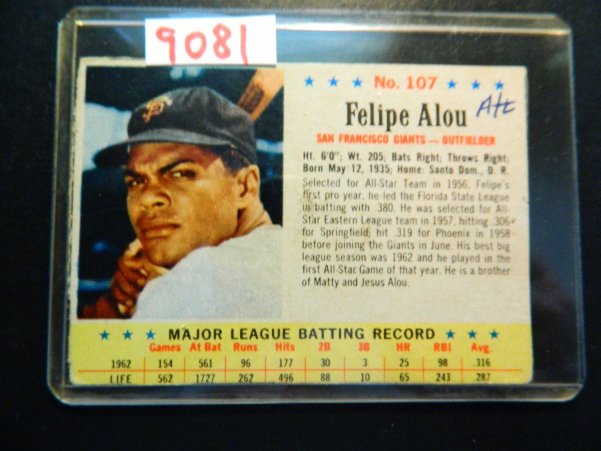 1963 Post Cereal #107 Felipe Alou Baseball Card, Hand Cut Card, ATL written in ink on card