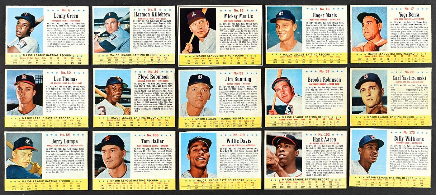 By far the most difficult Post cereal baseball set to complete, this set contains all the major stars of the day, with many tougher cards only produced on less popular brands of cereal, leading to very difficult 'short prints.' Includes: complete set of 200 cards w/ #6 Green (EX/MT), 15 Mantle (NM), 16 Maris (VG/EX), 17 Berra (EX/MT), 30 Lee Thomas (EX/MT), 39 Floyd Robinson (VG/EX), 53 Bunning (EX), 59 B. Robinson (VG/EX), 61 Adair (VG/EX), 80 Yastrzemski (GD), 86 Lumpe (VG), 87 Jimenez (VG/EX), 108 Haller (EX/MT), 119 W. Davis (VG), 128 Kasko (VG, cut short), 152 Aaron (EX/MT), 162 Flood (VG/EX), 166 Gibson (VG/EX), 172 B. Williams (EX/MT), 187 Aspromonte (VG) and 196 F. Thomas (EX). Grades VG/EX to EX/MT. Most cards are cut outside or on the line, with a small percentage in "the typical Post" fashion. Clean overall.