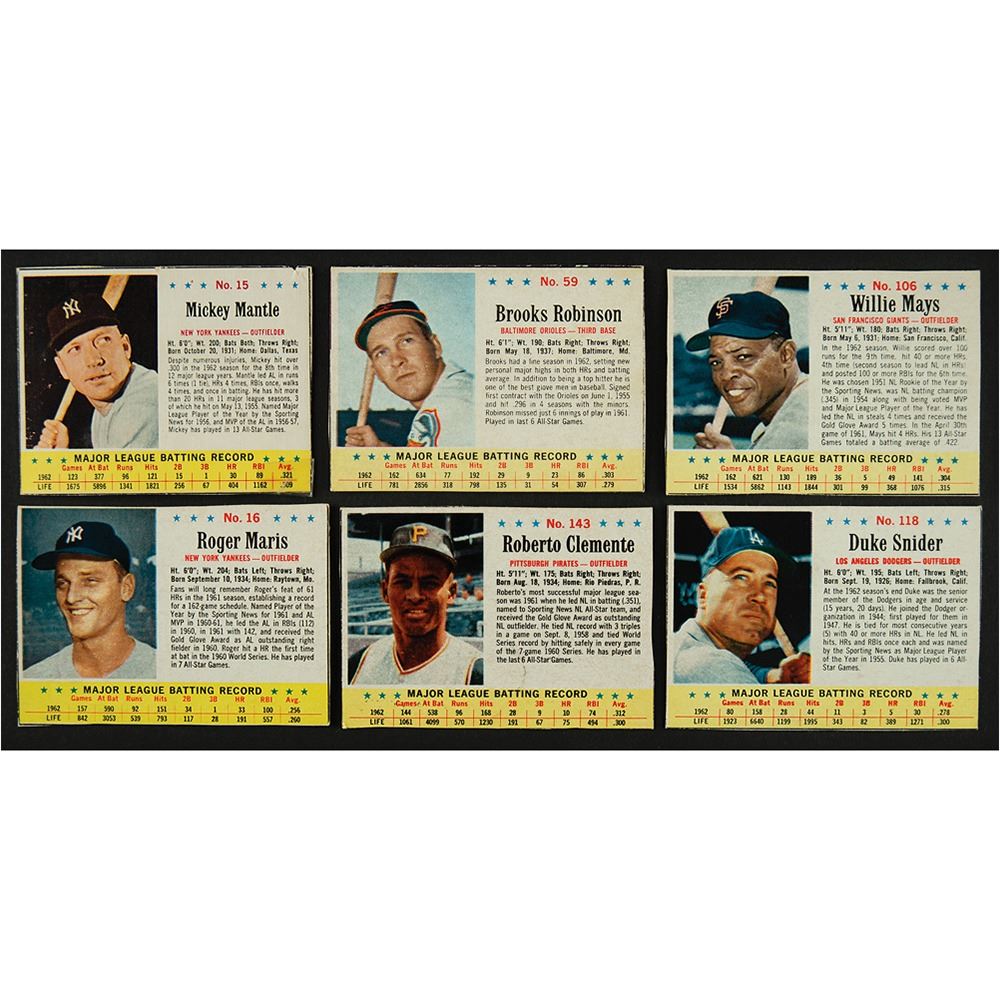 Partial set (127/200) of 1963 Post Cereal baseball cards, representing a significant portion of the set; also includes 22 duplicates and 11 Jello cards (very similar to the Post issue, but slightly smaller). The group totals 160 cards, including many Hall of Famers and short prints. Cards generally present as EX with many displaying all four borders from the hand-cut cereal box panels. Fewer than a dozen display creases. Key cards include: #16 Roger Maris (VG-EX+), #17 Yogi Berra (EX), #19 Whitey Ford (EX), #51 Al Kaline (EX), #59 Brooks Robinson (EX-MT), #66 Robin Roberts (EX), #106 Willie Mays (VG-EX+), #118 Duke Snider (EX), #131 Frank Robinson (VG-EX), #143 Roberto Clemente (VG-EX), #151 Eddie Mathews (EX), #166 Bob Gibson (VG), #169 Ernie Banks (VG-EX), and #197 Richie Ashburn (EX+). Jello cards include: #15 Mickey Mantle (P - tape on corner), #53 Jim Bunning (VG), and #117 Willie McCovey (G).