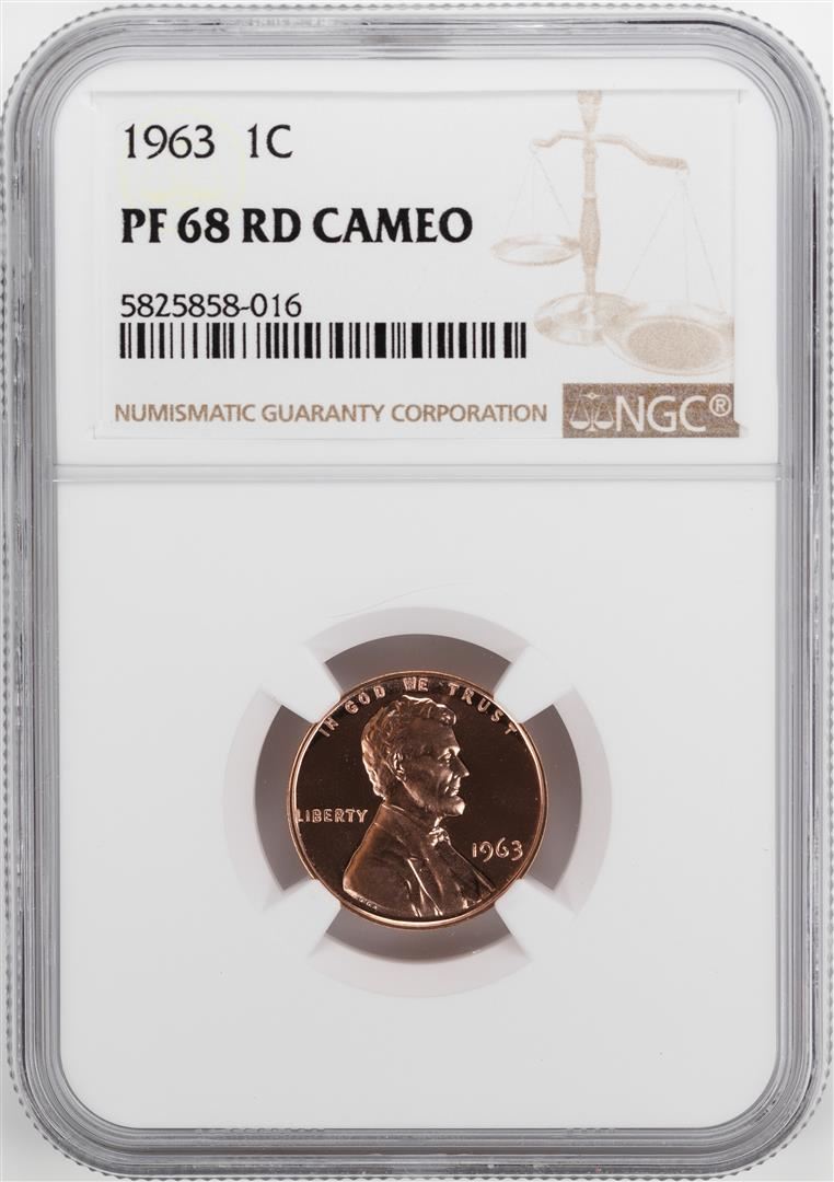 One 1963 Proof Lincoln Memorial Cent Coin NGC PF68RD Cameo. NGC Certified.