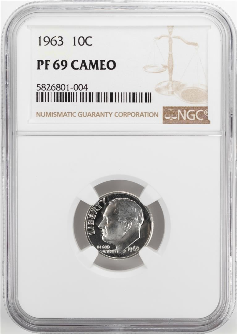 One 1963 Proof Roosevelt Dime Coin NGC PF69 Cameo. NGC Certified.