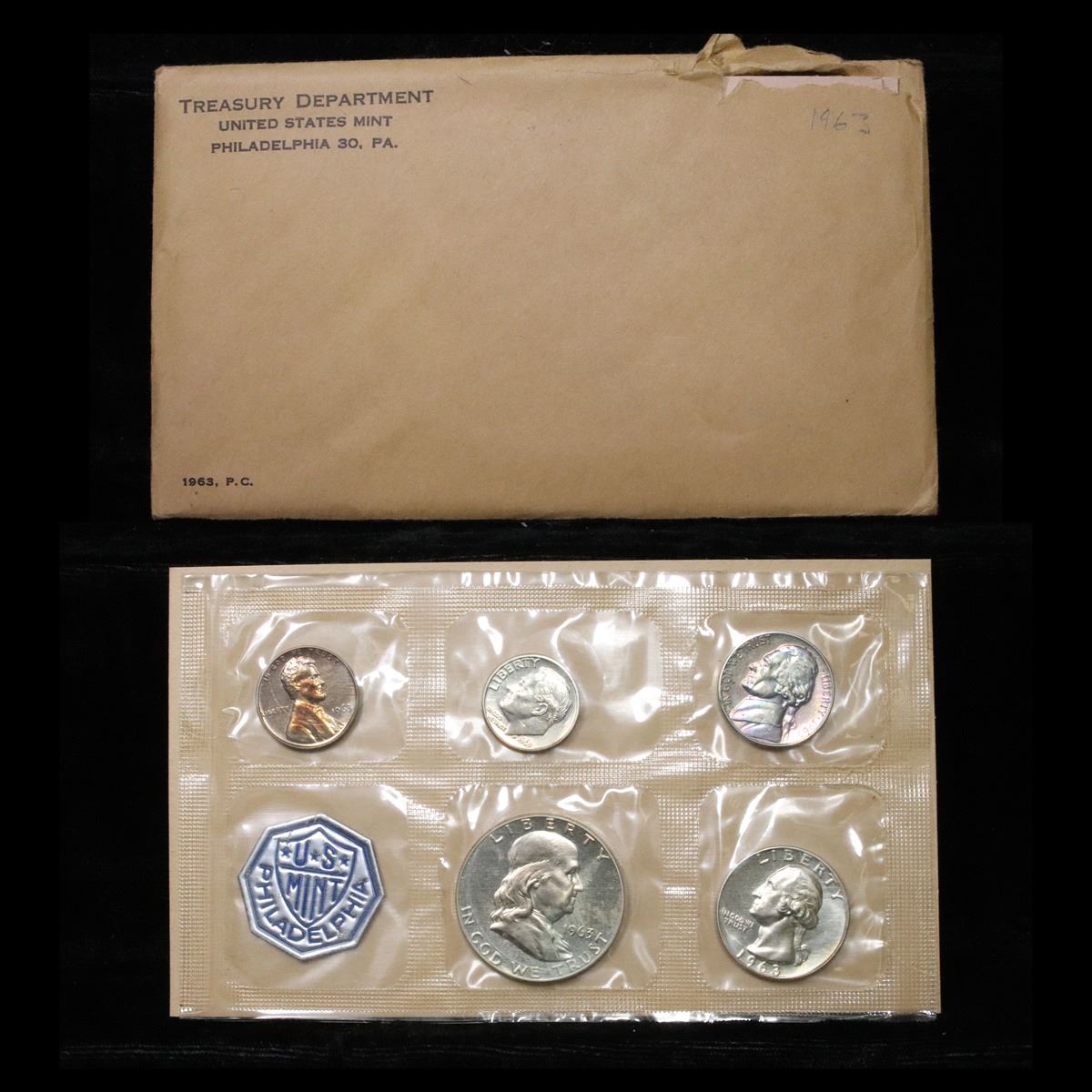 1963 Proof Set in Original mint packaging w/mint memo. This set, has a 90% Proof Silver Franklin Half Dollar, a 90% Proof Silver Quarter, a 90% Proof Silver Dime, plus the proof nickel and proof penny.