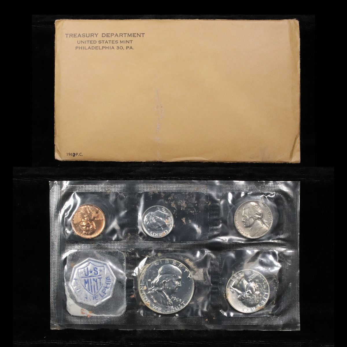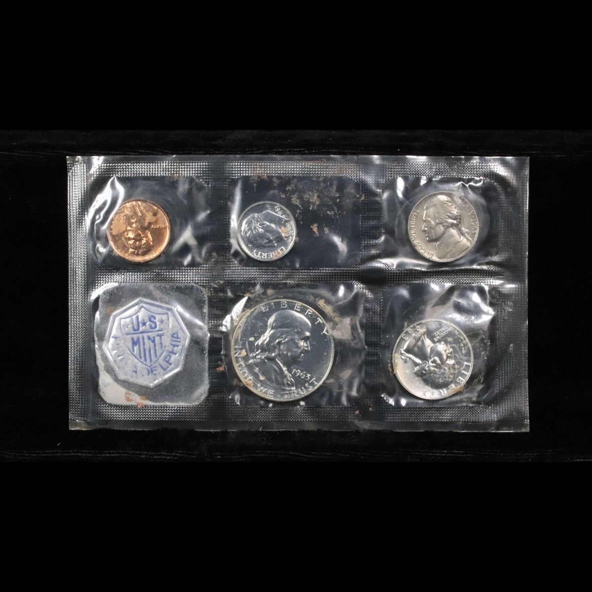 1963 Proof Set in Original mint packaging . The set, has a 90% Proof Silver Franklin Half Dollar, a 90% Proof Silver Quarter, a 90% Proof Silver Dime, plus the proof nickel and proof penny. All in the Original Packaging.