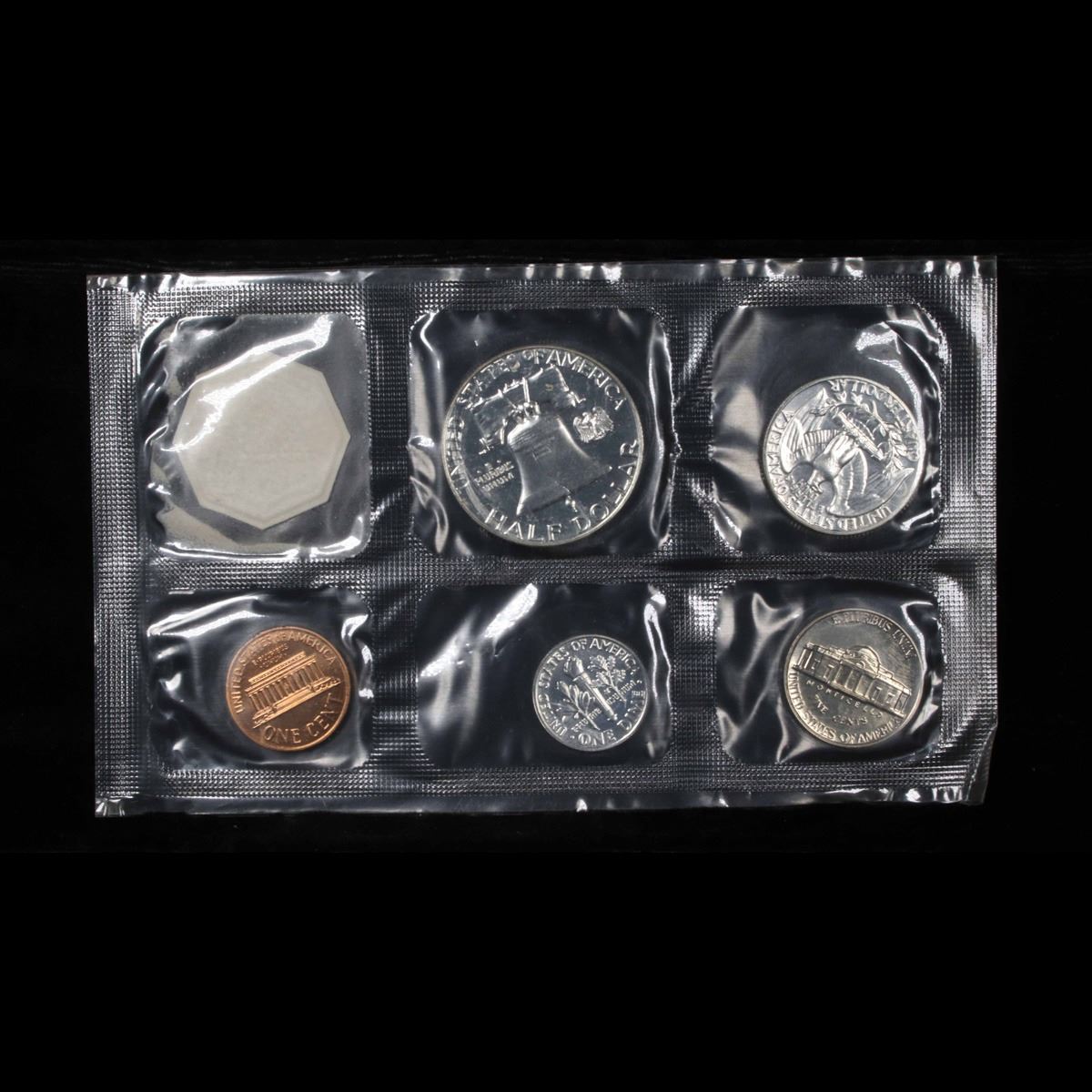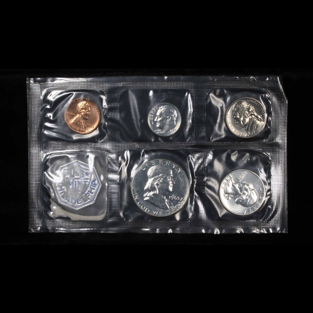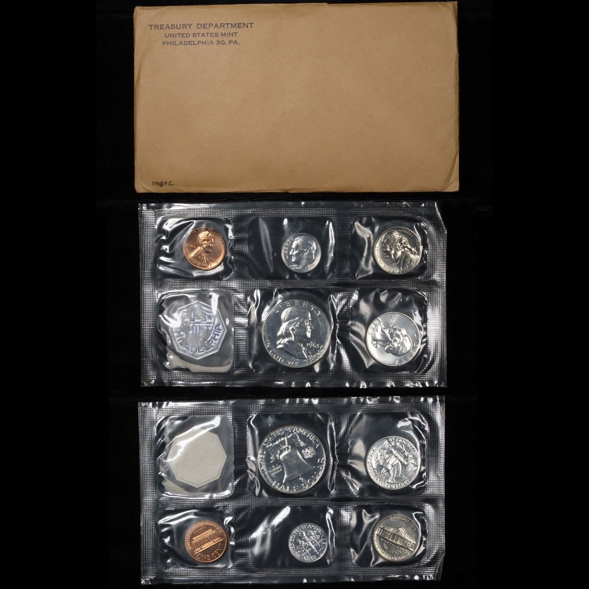 1963 Proof Set in Original mint packaging . This set, has a 90% Proof Silver Franklin Half Dollar, a 90% Proof Silver Quarter, a 90% Proof Silver Dime, plus the proof nickel and proof penny.