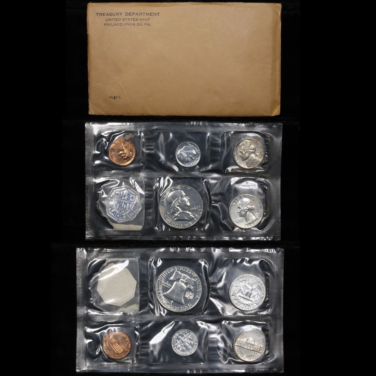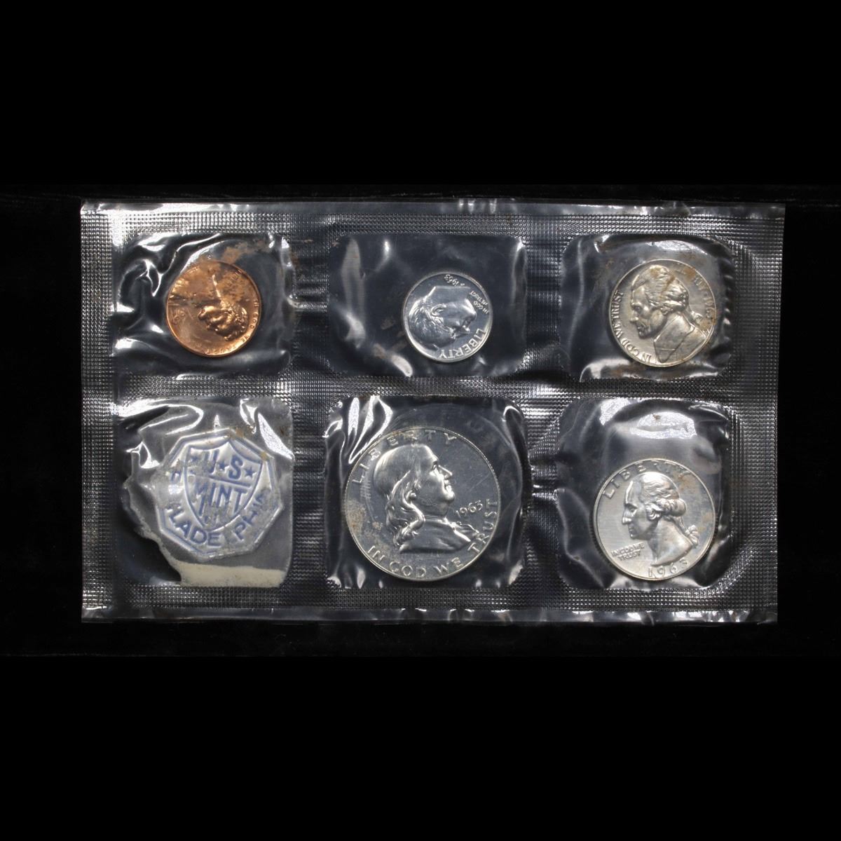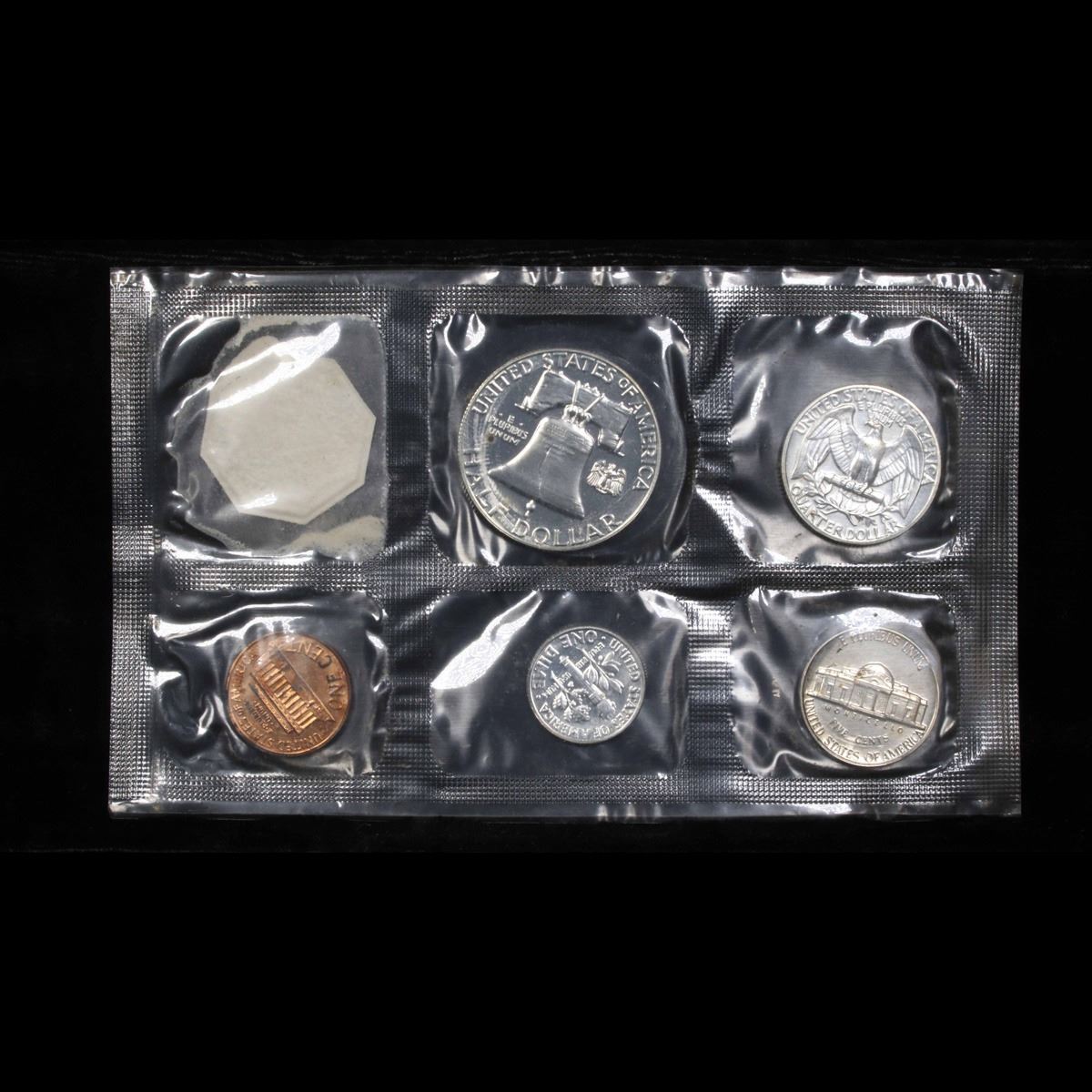 1963 Proof Set in Original mint packaging . This set, has a 90% Proof Silver Franklin Half Dollar, a 90% Proof Silver Quarter, a 90% Proof Silver Dime, plus the proof nickel and proof penny.