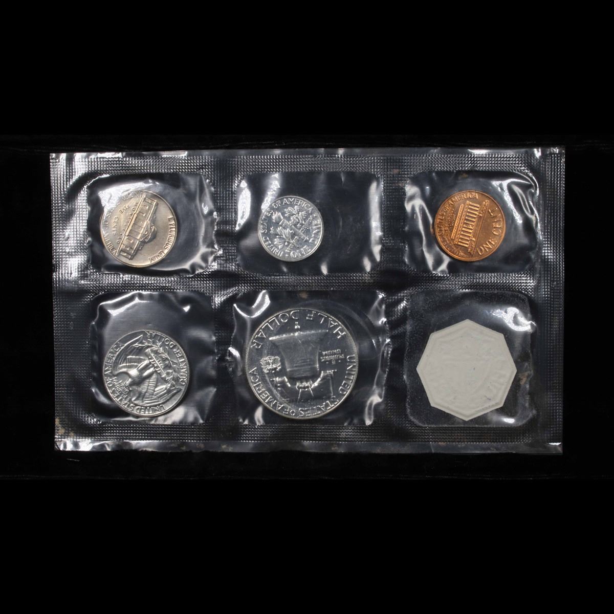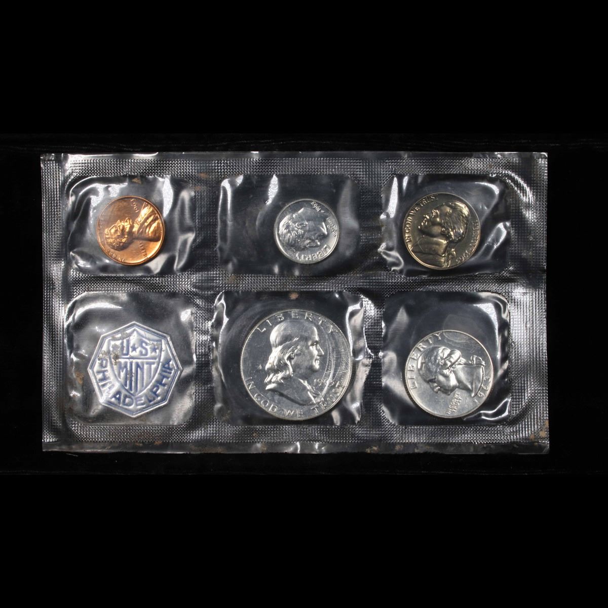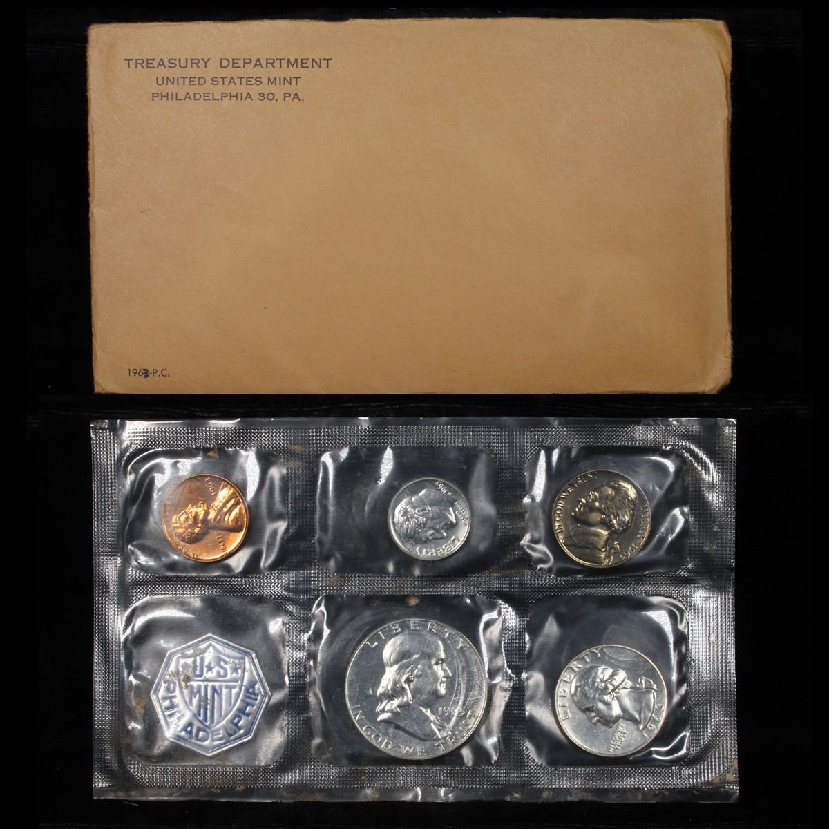 1963 Proof Set in Original mint packaging . This set, has a 90% Proof Silver Franklin Half Dollar, a 90% Proof Silver Quarter, a 90% Proof Silver Dime, plus the proof nickel and proof penny.