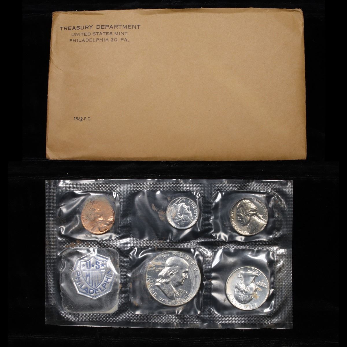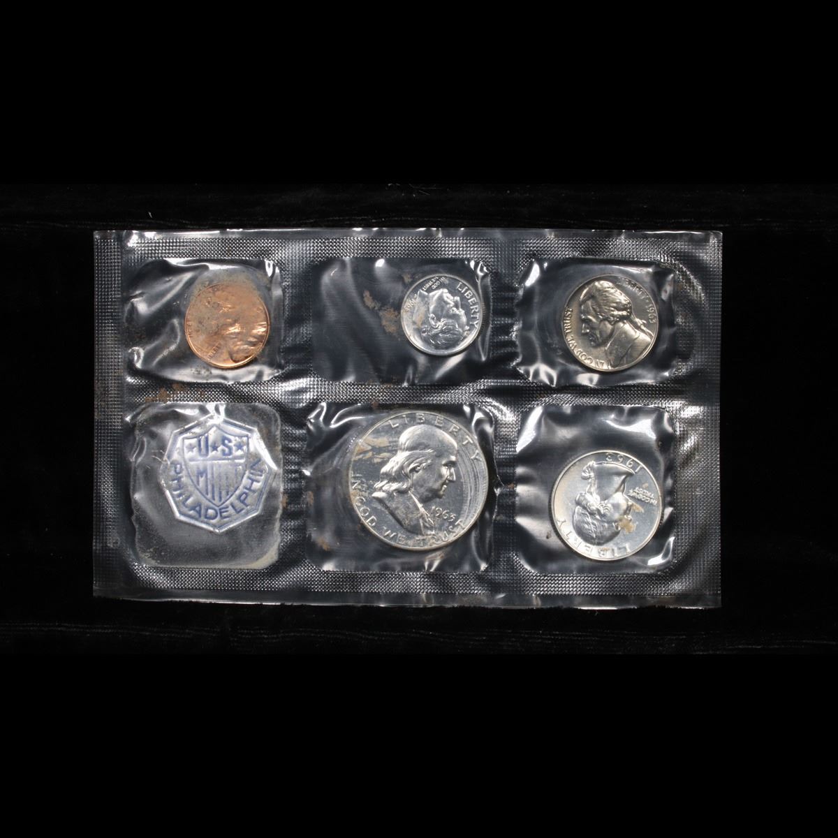 1963 Proof Set in Original mint packaging . This set, has a 90% Proof Silver Franklin Half Dollar, a 90% Proof Silver Quarter, a 90% Proof Silver Dime, plus the proof nickel and proof penny.