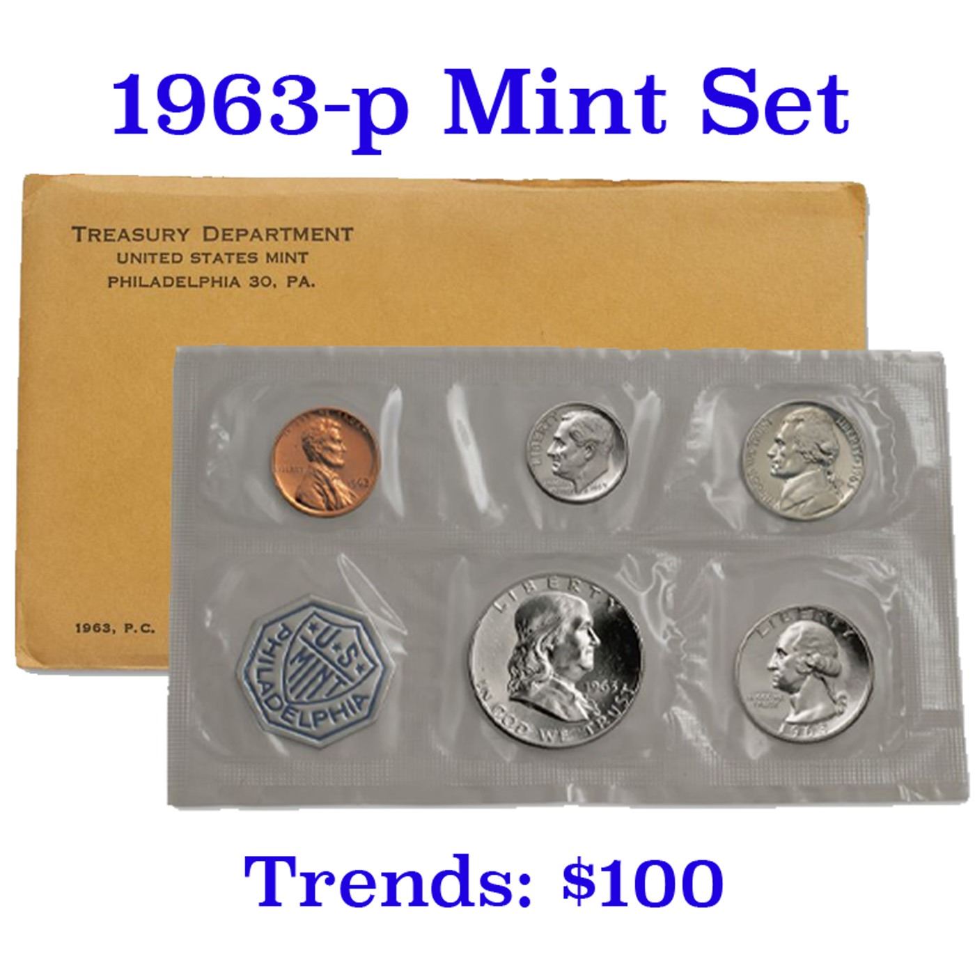 1963 Proof Set in Original mint packaging . This set, has a 90% Proof Silver Franklin Half Dollar, a 90% Proof Silver Quarter, a 90% Proof Silver Dime, plus the proof nickel and proof penny.