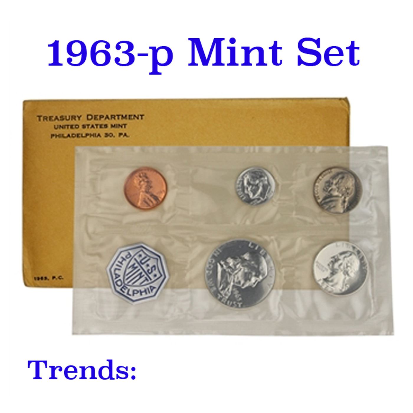 1963 Proof Set in Original mint packaging . This set, has a 90% Proof Silver Franklin Half Dollar, a 90% Proof Silver Quarter, a 90% proof Silver Dime, plus proof nickel and proof penny. All in the Original Packaging with the envelope, but no Mint Memo. This set is all PR65 or better.