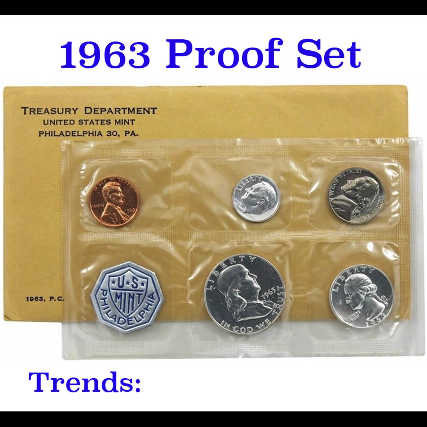 1963 Proof Set in Original mint packaging   .        This set, has a 90% Proof Silver Franklin Half Dollar, a 90% Proof Silver Quarter, a 90% Silver Proof Dime, 2 Other Proof Coins, all in the Original Packaging with the envelope and the Mint Memo.  All 5 coins grade PR65+ or better.