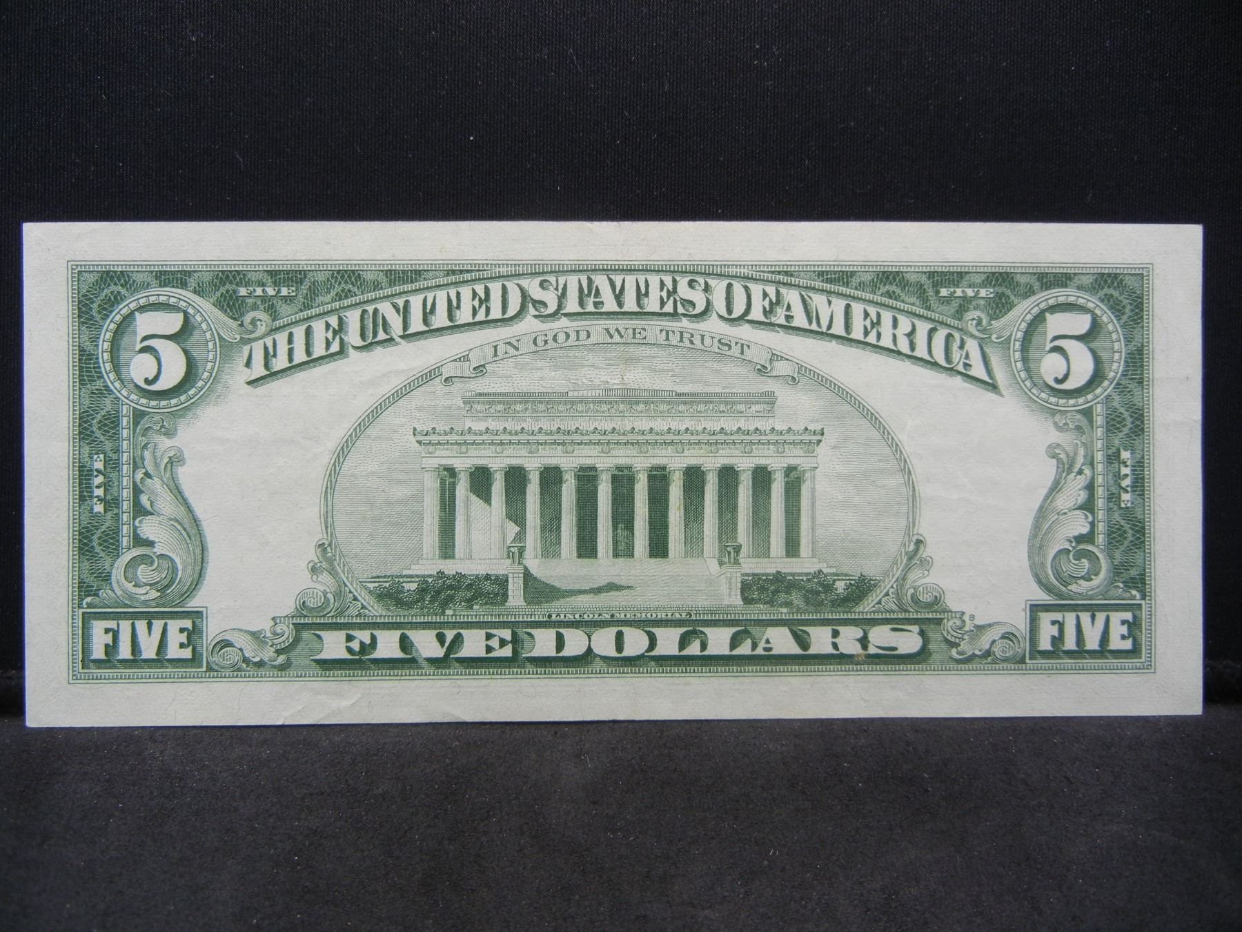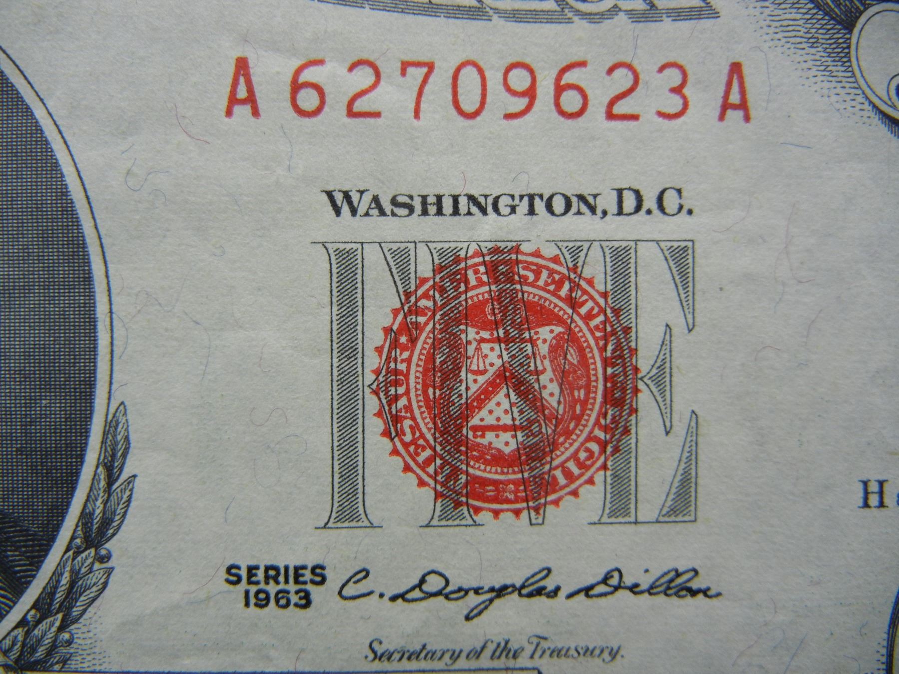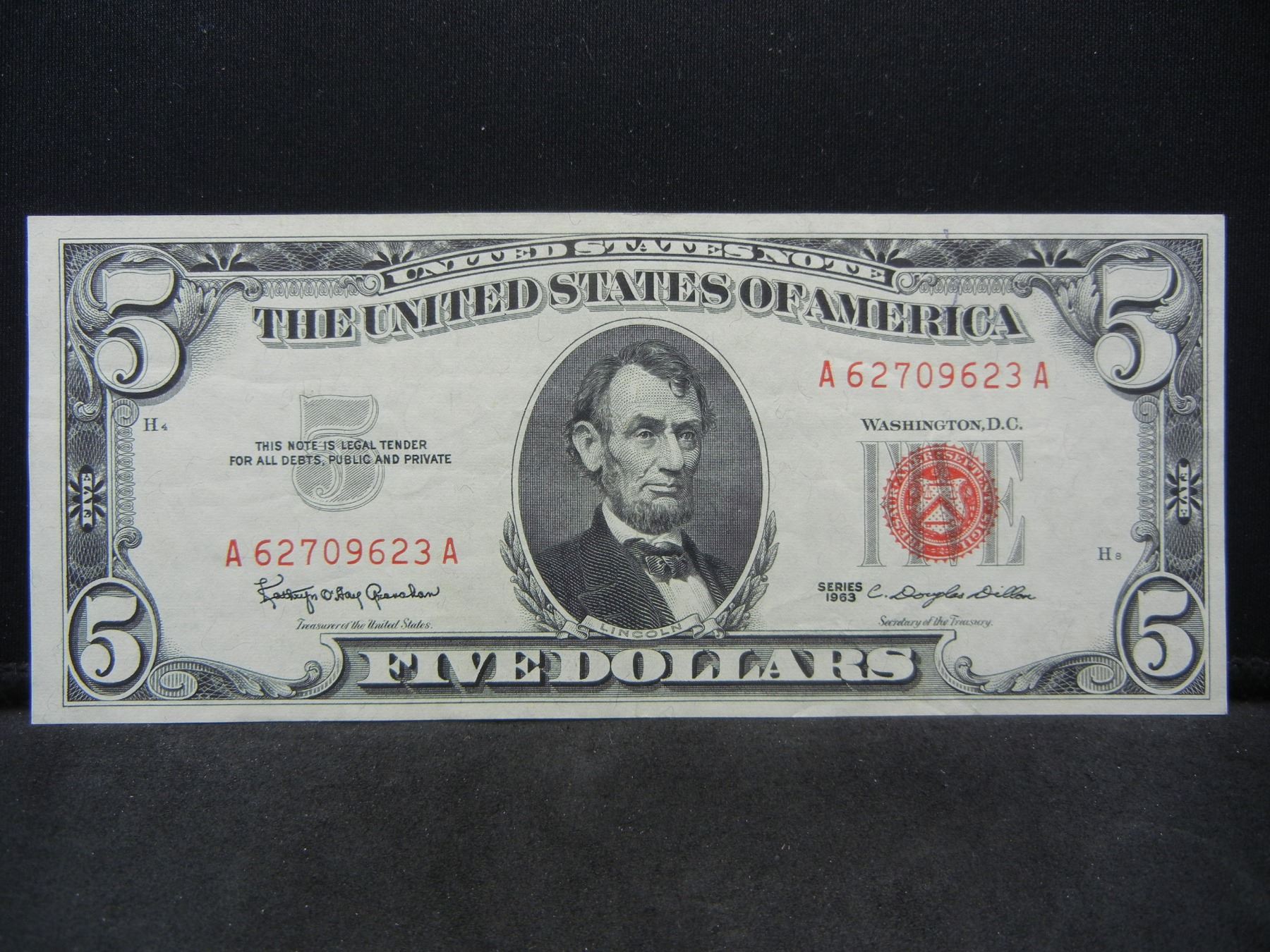 1963 Red Seal $5 Note. Almost Uncirculated.