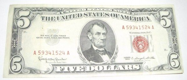 1963 SERIES $5 RED SEAL CERTIFICATE SERIAL # A59341524A *RARE CRISP AU HIGH GRADE NICE BILL*! ***Coin, Currency & All Items Listed in this auction - Grades, Conditions and Values are not Safe Deposit Coins LLC Responsibilty. Grades, Condition and Values are determined by Consigner(s) & Buyers ONLY
