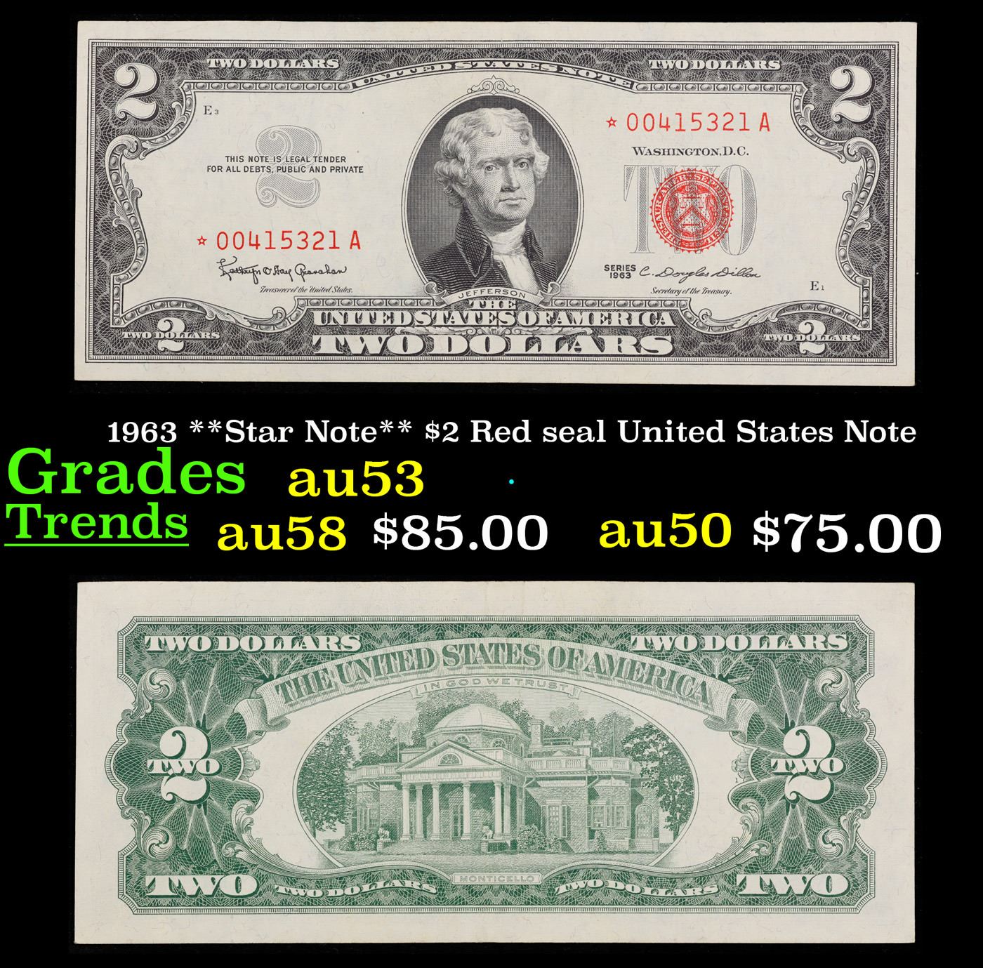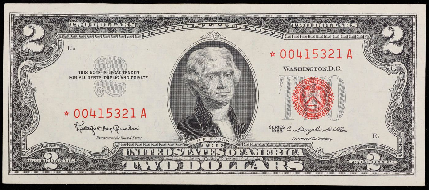 1963 **Star Note** $2 Red seal United States Note Grades Select AU. 1963 Legal Tender (United States Note). 1963 marks the last year that red seals were printed on two dollar bills. This is also the last year that Monticello was used on the back of two dollar bills. All two dollar bills from 1963 have a red seal on the right hand side of the bank note.