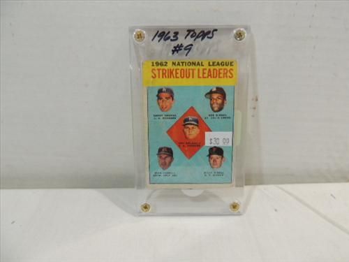 1963 TOPPS #9 BASEBALL STIRKEOUT LEADER CARD: KOUFAX, DRYSDALE, GIBSON. AS SHOWN. VIEW PICTURE FOR DETAIL.