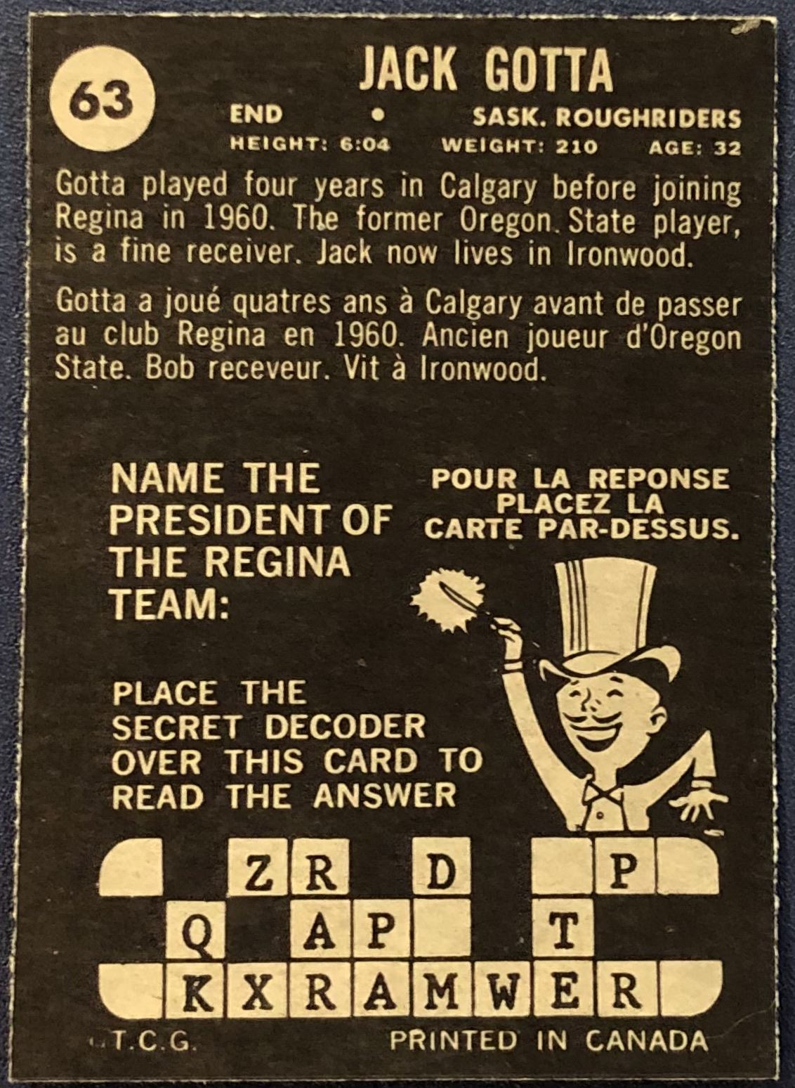 Card #63 CFL, football, vintage, OPC, hall of fame