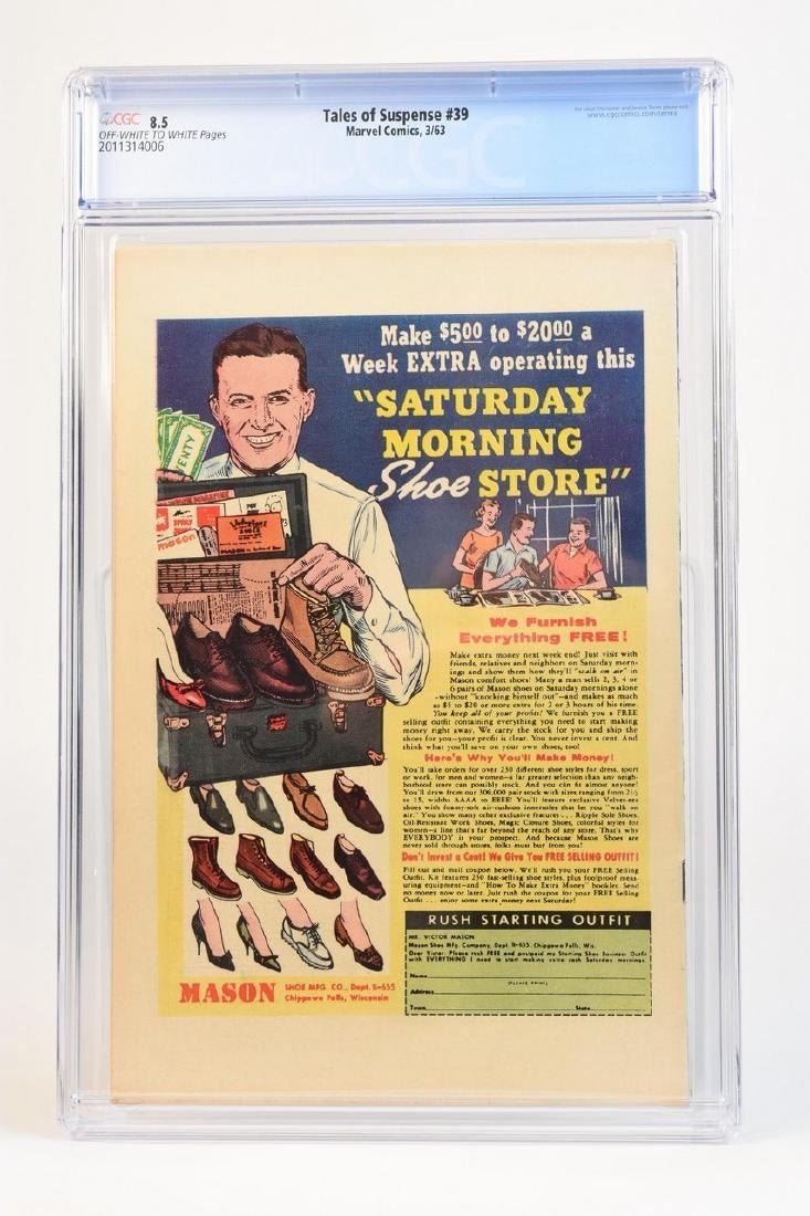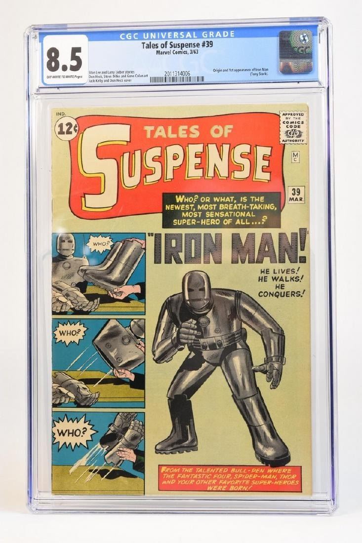1963 Tales of Suspense #39 CGC 8.5 (off-white to white) Stan Lee and Larry Lieber stories Don Heck, Steve Ditko, and Gene Colan art. Jack Kirby and Don Heck cover. Origin and 1st appearance of Iron Man (Tony Stark).