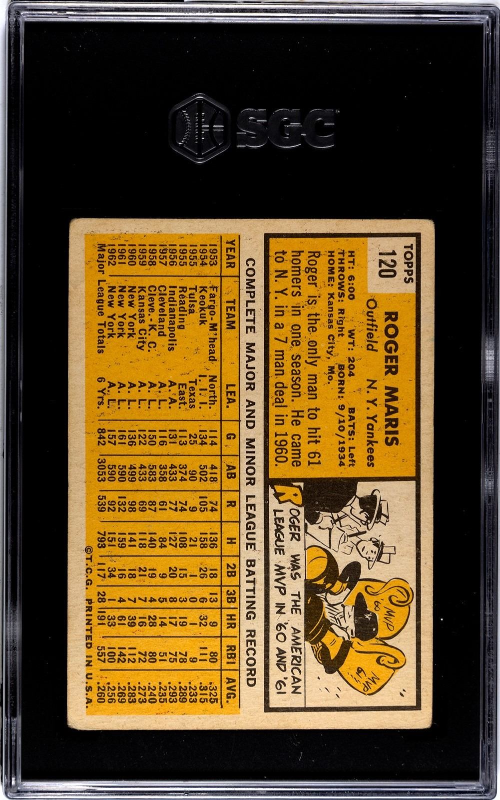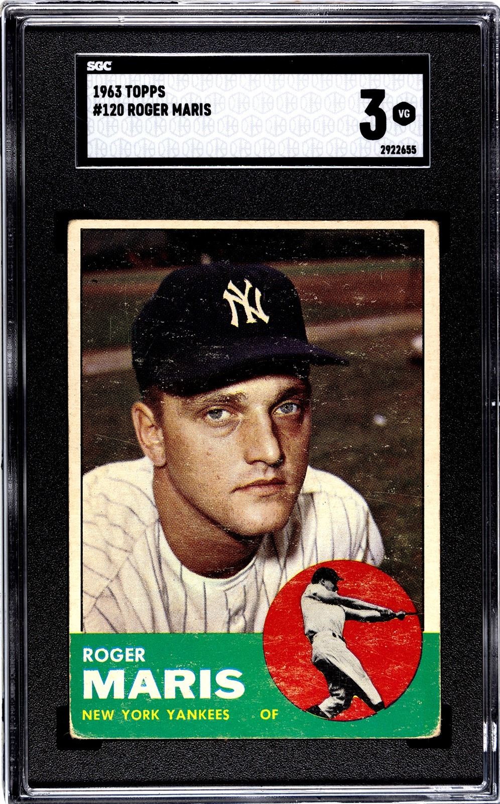 Lower grade example of Maris' 63 Topps card, only 2 years removed from his epic 1961 campaign where he broke Babe Ruth's record of 60 HRs in a single season. He put together back-to-back MVP seasons in 1960 and 1961, but never was able to sustain that level of productivity. Perhaps the pressure (and fallout) from breaking such a hallowed record took it's toll. This one grades 3 VG by SGC.
