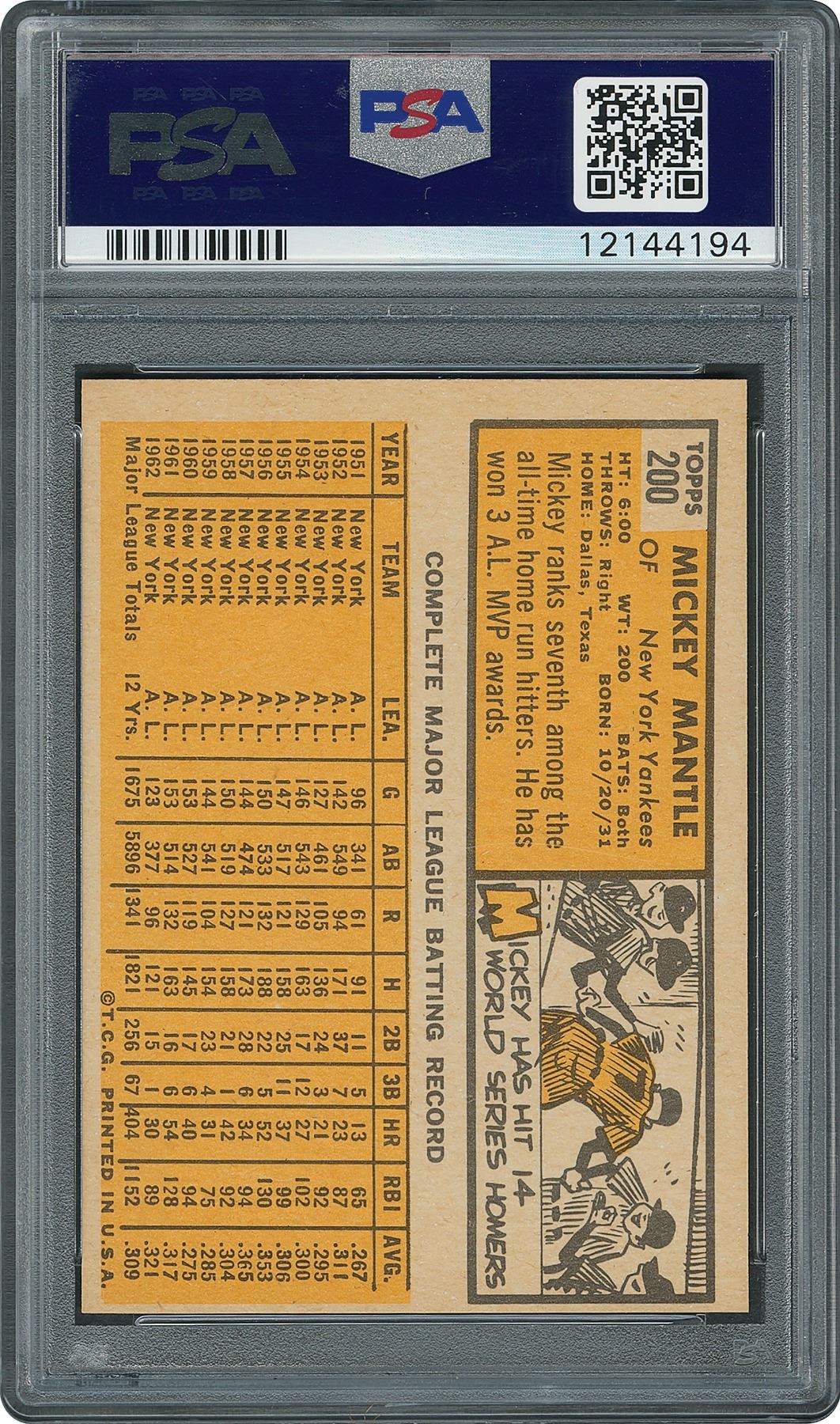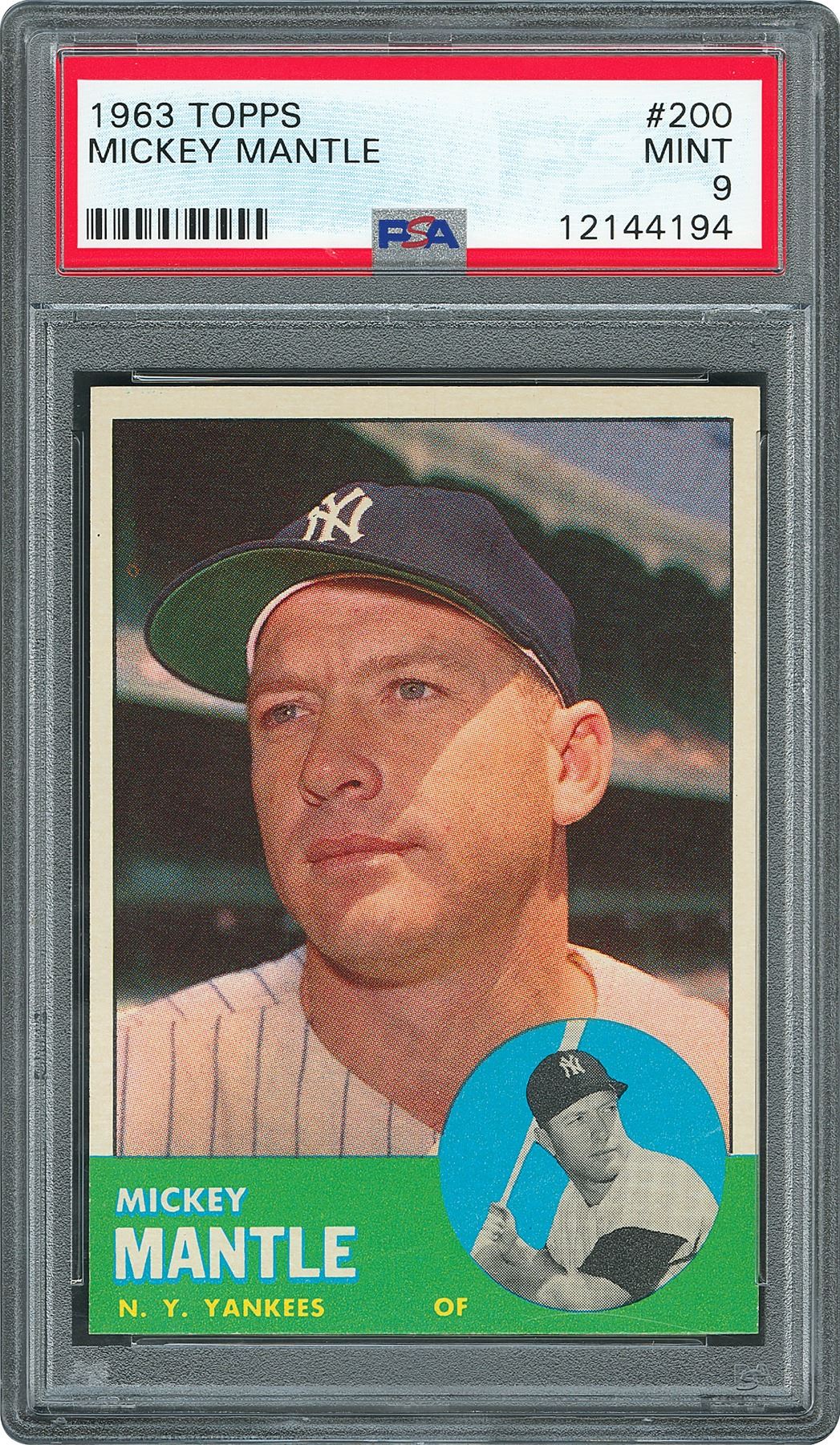 Graded by PSA MINT 9. This is an outstanding 1963 Topps Mantle, sporting intense, bold colors that delight the senses. This specimen clearly deserves the fault-free status defined by its MINT 9 grade. There is no evidence of wear on the sharp, well-shaped corners. The green caption area is virtually impeccable, and the pristine uninterrupted gloss adds to this card's uncirculated appearance. The reverse is clean and free of stains. A superior 1963 Topps Mantle! This is one of the most difficult Mickey Mantle cards from the 1960s in which to obtain a MINT 9 grade, and there are only two examples which grade higher. Fully satisfying MINT condition.