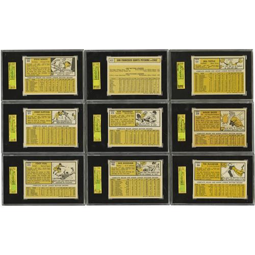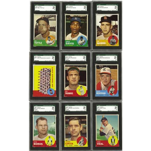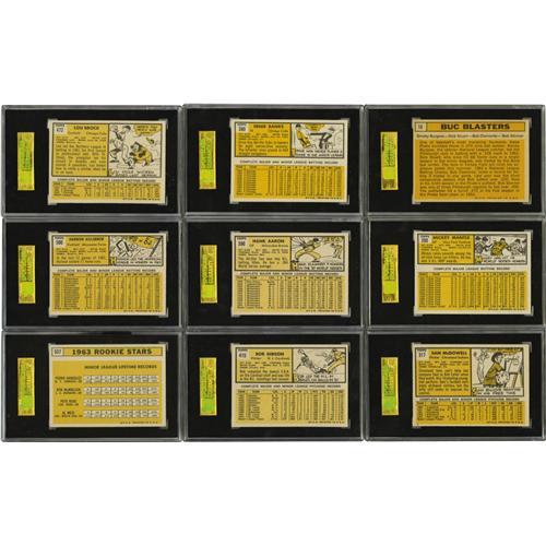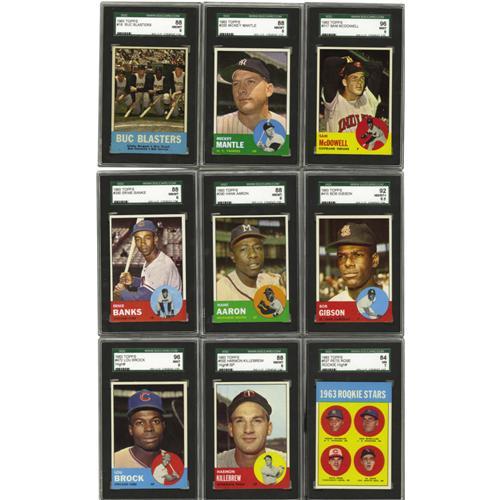 <B>1963 Topps Complete Set Plus Variations (580).</B></I> The 1963 Topps set is among the most popular of its era, due in large part to the attractive card design and the inclusion of one of the most collectible cards in history -- the high-numbered Pete Rose rookie. A total of 32 cards have been graded by SGC with an aggregate SMR of $5676. In addition to the regular 576-card issue, this offering includes four (#29, 54, 102, 431) of the possible seven variation cards, resulting in a total of 580 cards. Graded cards - <B>SGC 96 MT 9:</B></I> 13 cards - #127, 229, 257, 317, 394 McCarver, 410, 417, 472 Brock, 475, 492, 532, 571, 573; <B>SGC 92 NM/MT+ 8.5:</B></I> 8 cards - #235, 355, 374, 379, 381, 393, 409, 415 Gibson; <B>SGC 88 NM/MT 8:</B></I> 8 cards - #2 AL Batting Leaders, 18 Buc Blasters, 200 Mantle, 241, 364, 380 Banks, 390 Aaron, 500 Killebrew; <B>SGC 86 NM+ 7.5</B></I> #275 Mathews; <B>SGC 84 NM 7:</B></I> #138 Pride of the NL, 537 Rose. Ungraded cards include #1, 3, 25, 68, 115, 120, 169, 173, 210, 242, 250, 300, 320, 340, 345, 360, 400, 412, 440, 446, 466, 470, 473, 490, 525, 540, 544, 550, 553. Set grades 38% NM to NM/MT, 57% EX to EX/MT, 5% VG to VG/EX.