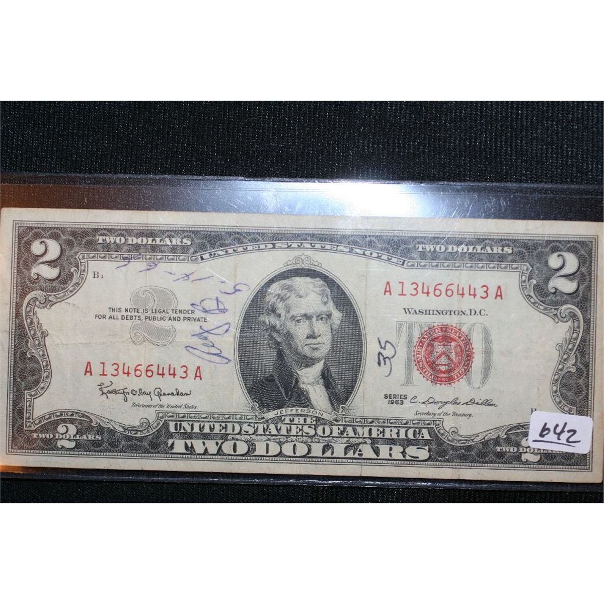 1963 Two Dollar Federal Reserve Note, Red Seal #A13466443A
