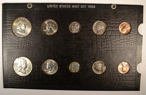 1963 U.S. MINT SET MS-65 COINS, 10 COINS IN OLD RAYMOND BOARD
