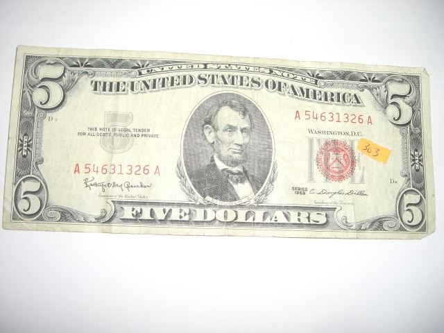 1963 US $5.00 *RED SEAL* BILL SERIAL # A54631326A!! BILL CAME OUT OF SAFE!! ***Coin, Currency & All Items Listed in this auction - Grades, Conditions and Values are not Safe Deposit Coins LLC Responsibilty. Grades, Condition and Values are determined by Consigner(s) & Buyers ONLY