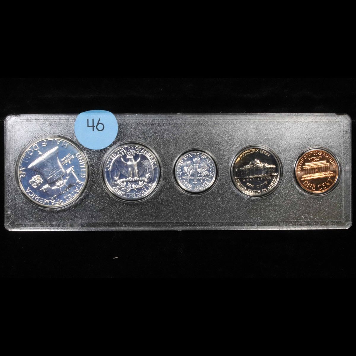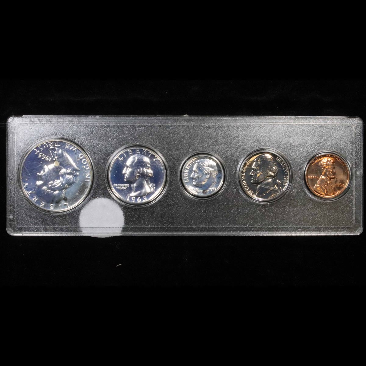 1963 United States Proof Set in Whitman Plastic Holder.        This set, has a 90% Proof Silver Franklin Half Dollar, a 90% Proof Silver Quarter, a 90% Proof Silver Dime, plus the proof nickel and proof penny.   All encased in a Whitman Plastic Holder.