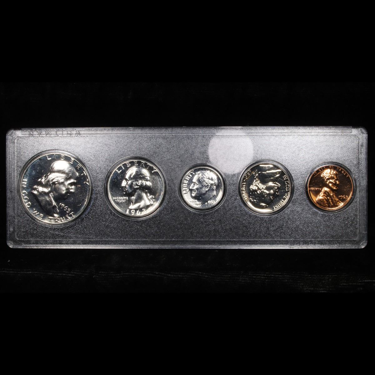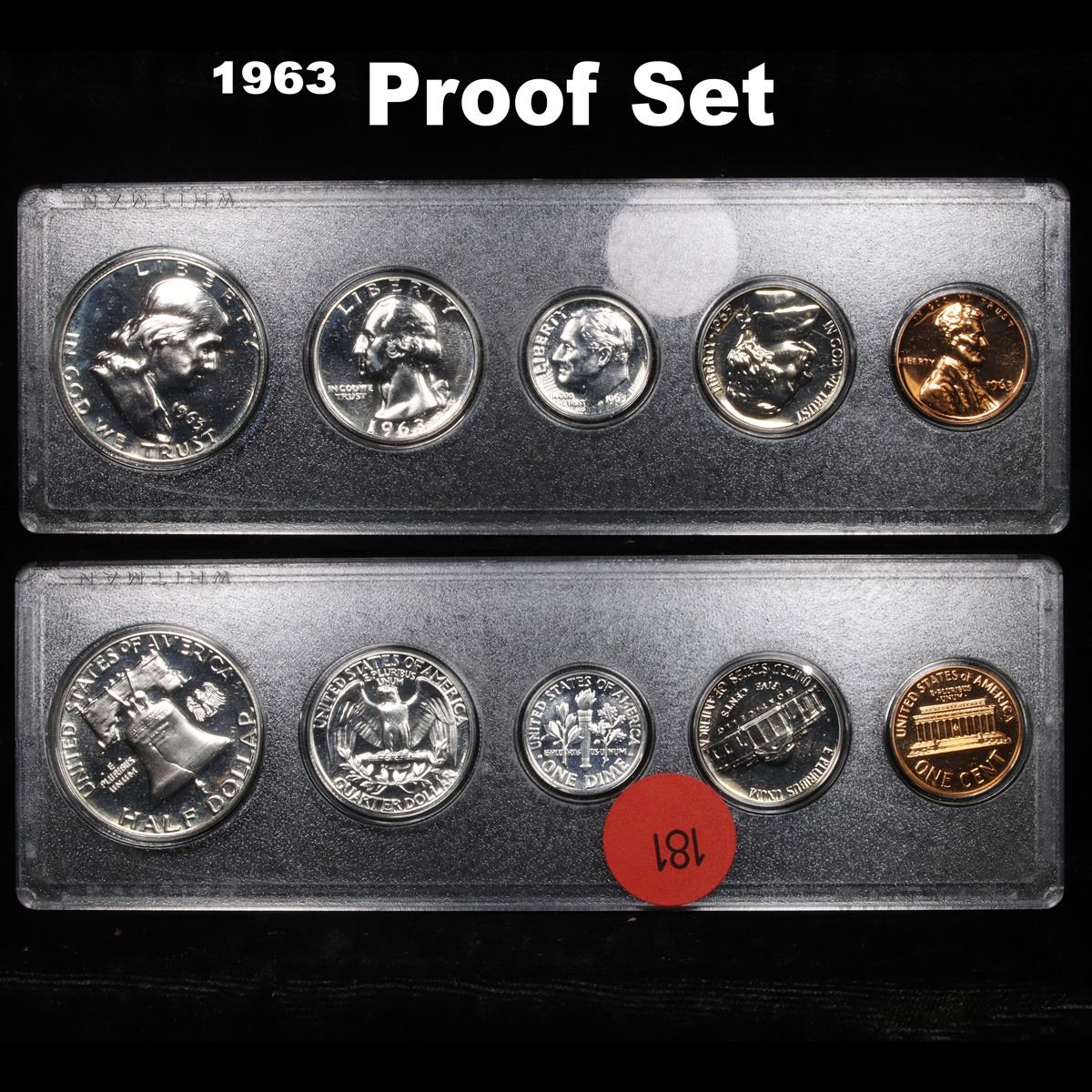 1963 United States Proof Set in Whitman Plastic Holder. This set, has a 90% Proof Silver Franklin Half Dollar, a 90% Proof Silver Quarter, a 90% Proof Silver Dime, plus the proof nickel and proof penny. All encased in a Whitman Plastic Holder.