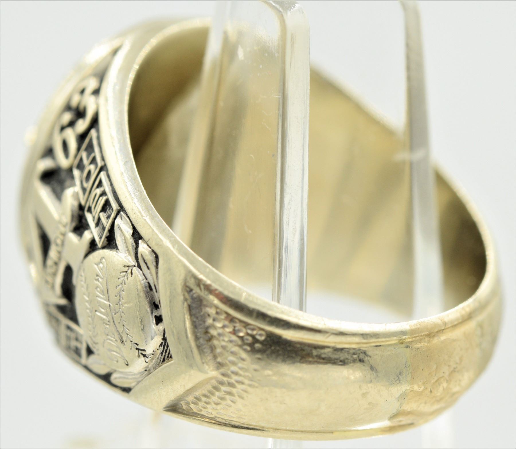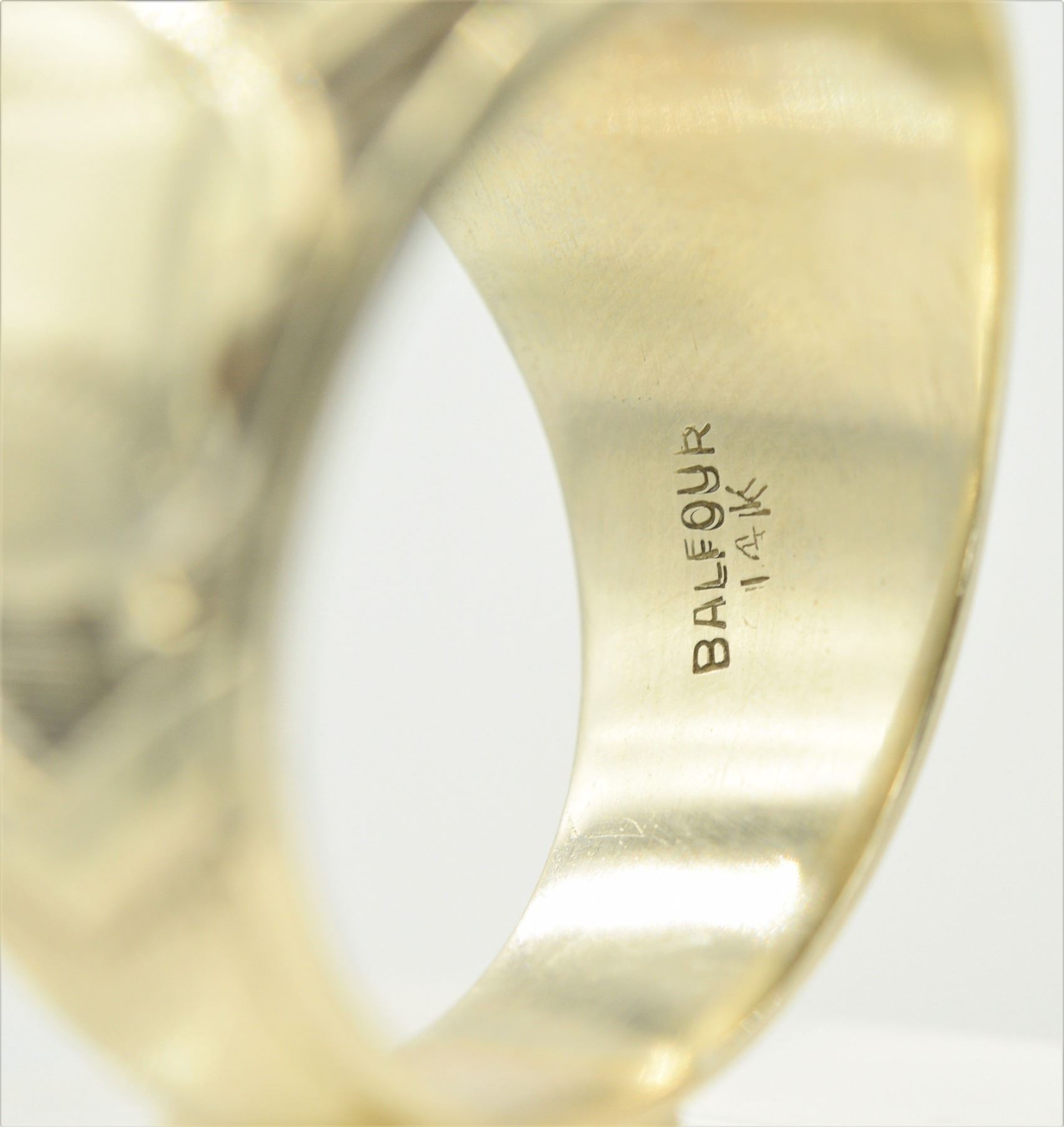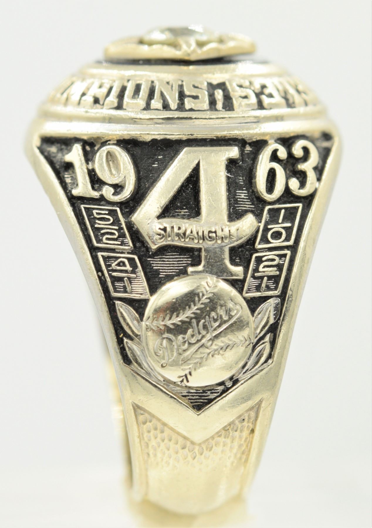 1963 LA Dodgers/New York Yankees World Series Ring. 1963 L.A. Dodgers World Championship ring. Top of the ring has a large round brilliant cut diamond weighing .65cts, encircled by the words "Los Angeles World Champions". One side displays a crossed bats and ball motif, the other side has the Dodgers script logo on a baseball with a "4 straight" design along with the scores of each game of the Dodgers' four game sweep of the Yankees in the series. The year "1963" also appears at top. Marked "Balfour 14K" on the interior ring band. Ring shows minimal wear. The 1963 World Series matched the two-time defending champion New York Yankees against the Los Angeles Dodgers, with the Dodgers sweeping the Series in four games to capture their second title in five years. This was the first time that the New York Yankees were swept in a World Series in four games. Starting pitchers Sandy Koufax, Don Drysdale, Johnny Podres and ace reliever Ron Perranoski combined to give up only four runs in four games. Ring Size 12 1/2.