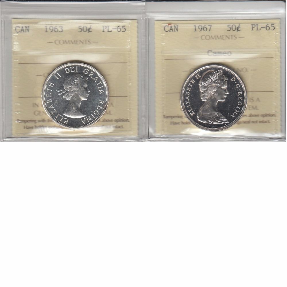 1963 and 1967 Canada 50-cent ICCS Certified both PL-65 graded. 2pcs