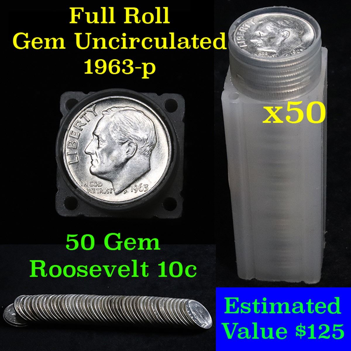 1963-p Roosevelt 10c roll, 50 pieces. A real find. A great roll of brilliant uncirculated Roosevelt dimes. All 1963-p. Trends lists ms64 at $10/each, $500