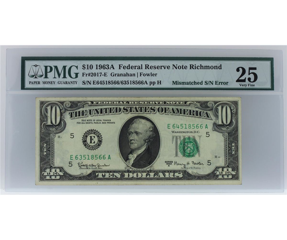 One 1963A $10 Mismatched S/N Error Federal Reserve Note Richmond FR-2017-E PMG Graded Very Fine 25. PMG Appraised.