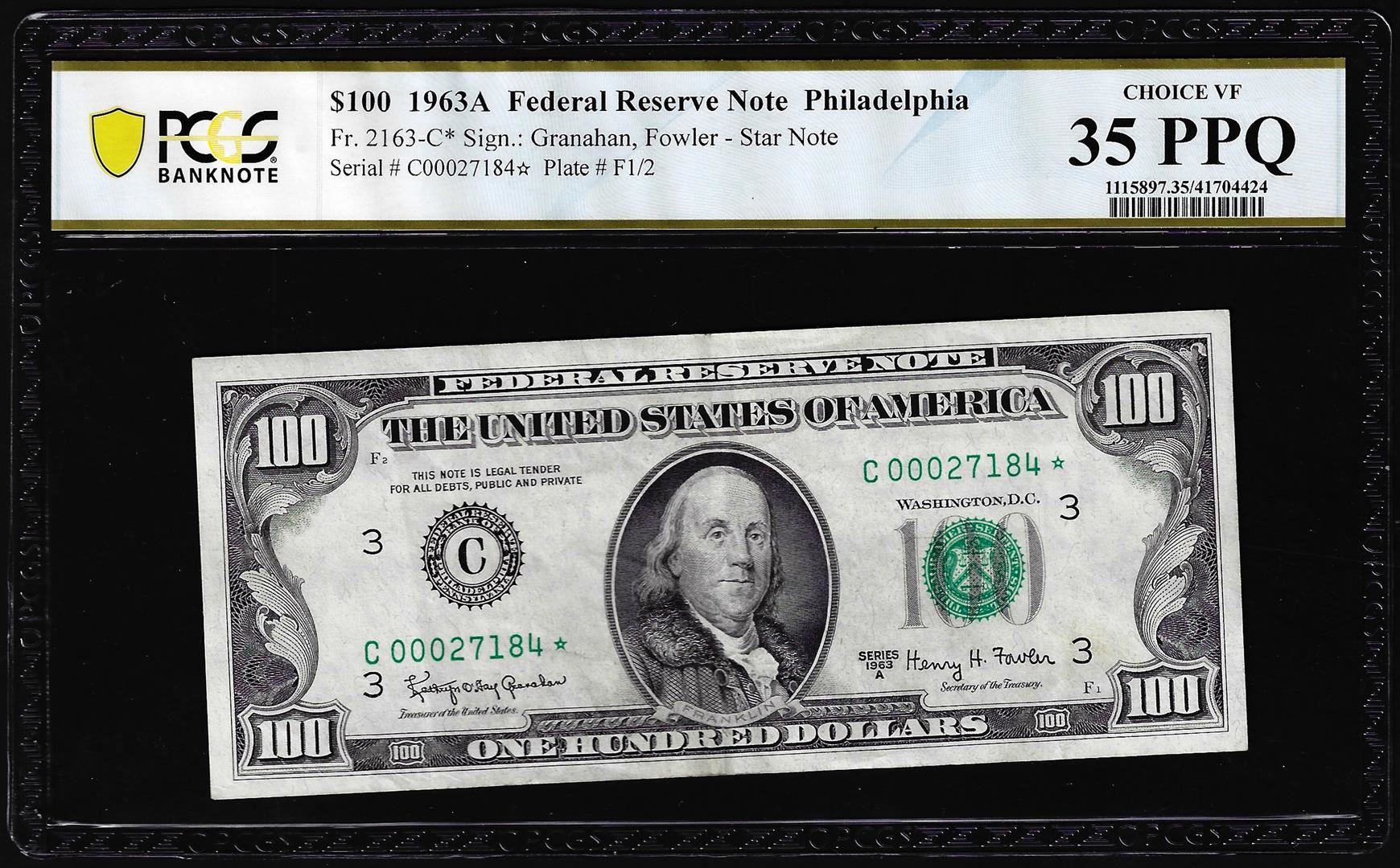 1963A $100 Federal Reserve Star Note Philadelphia Fr.2163-C* PCGS Choice VF 35PPQ