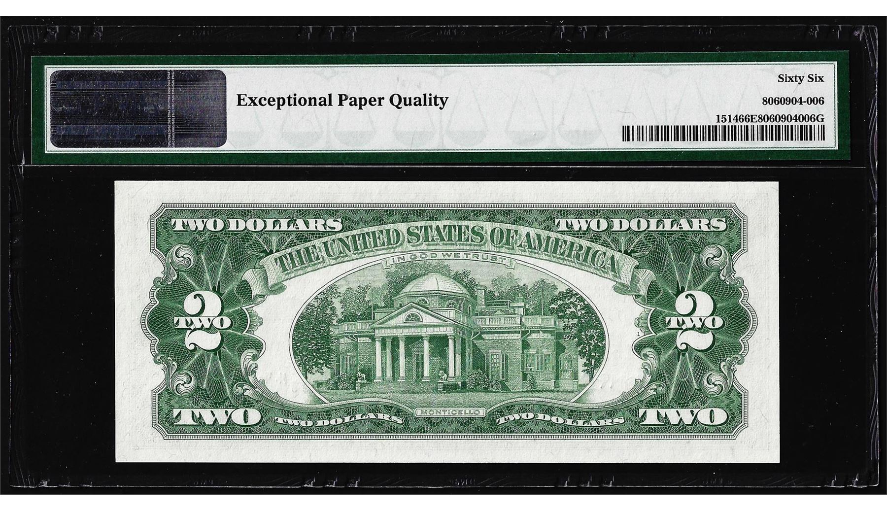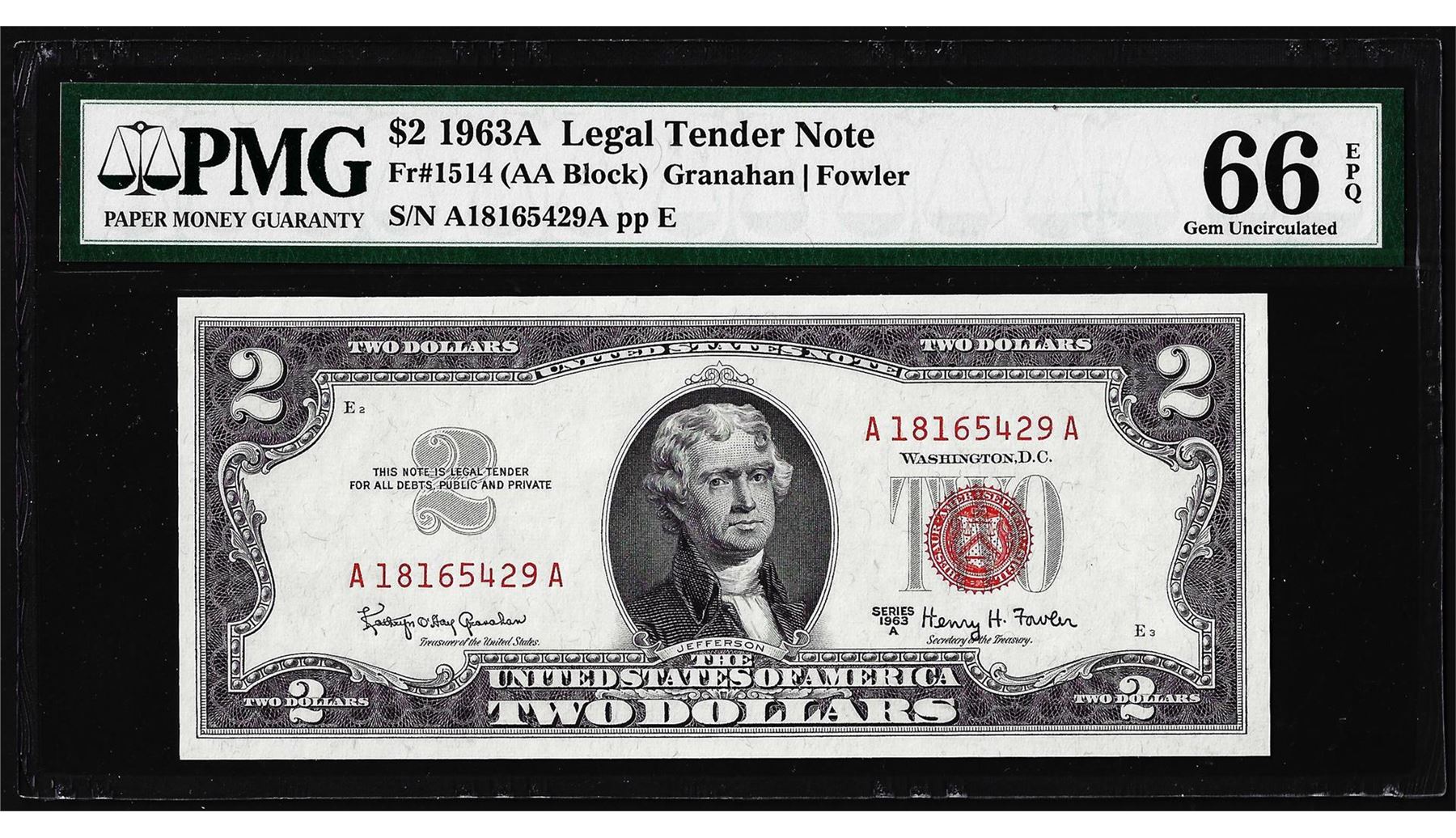 One 1963A $2 Legal Tender Note Fr.1514 PMG Gem Uncirculated 66EPQ. PMG Certified.