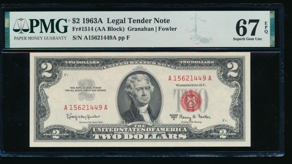 One 1963A $2 Legal Tender Note PMG 67EPQ.
