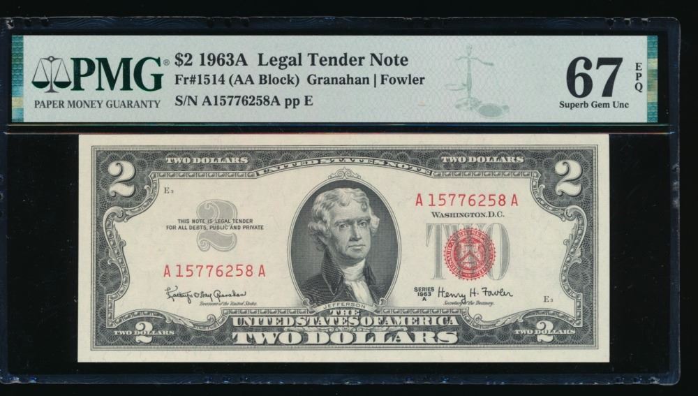 One 1963A $2 Legal Tender Note PMG 67EPQ.