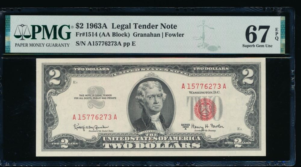 One 1963A $2 Legal Tender Note PMG 67EPQ.