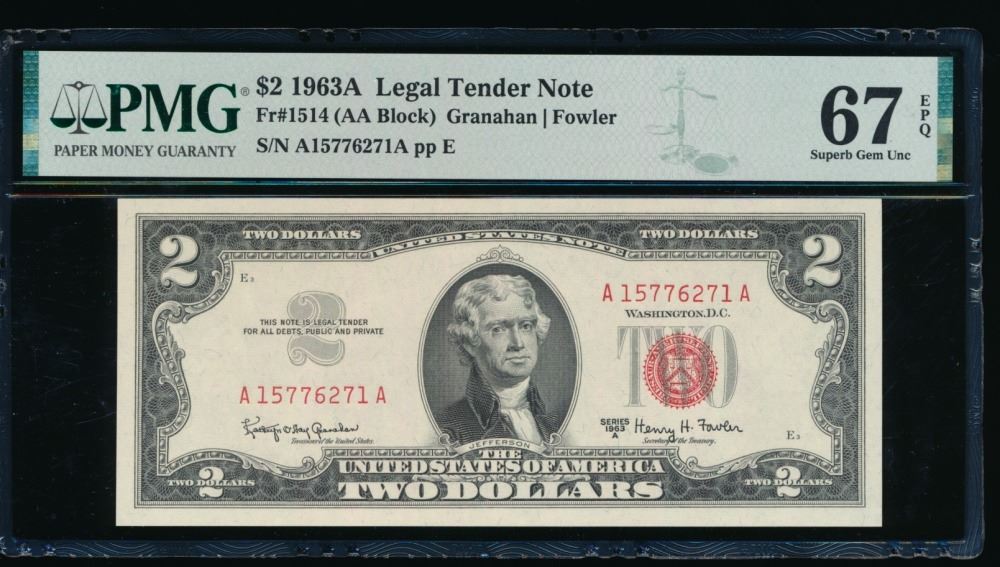One 1963A $2 Legal Tender Note PMG 67EPQ.
