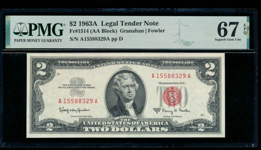 One 1963A $2 Legal Tender Note PMG 67EPQ.
