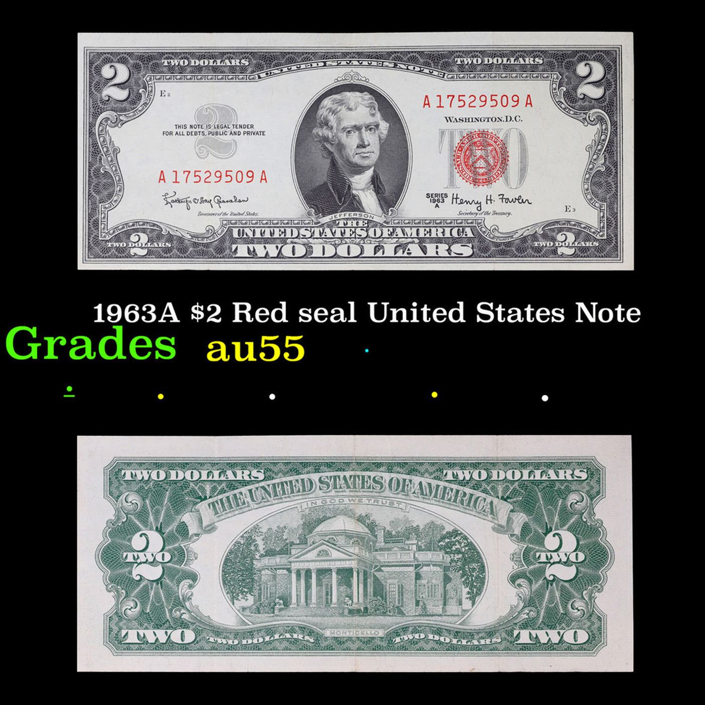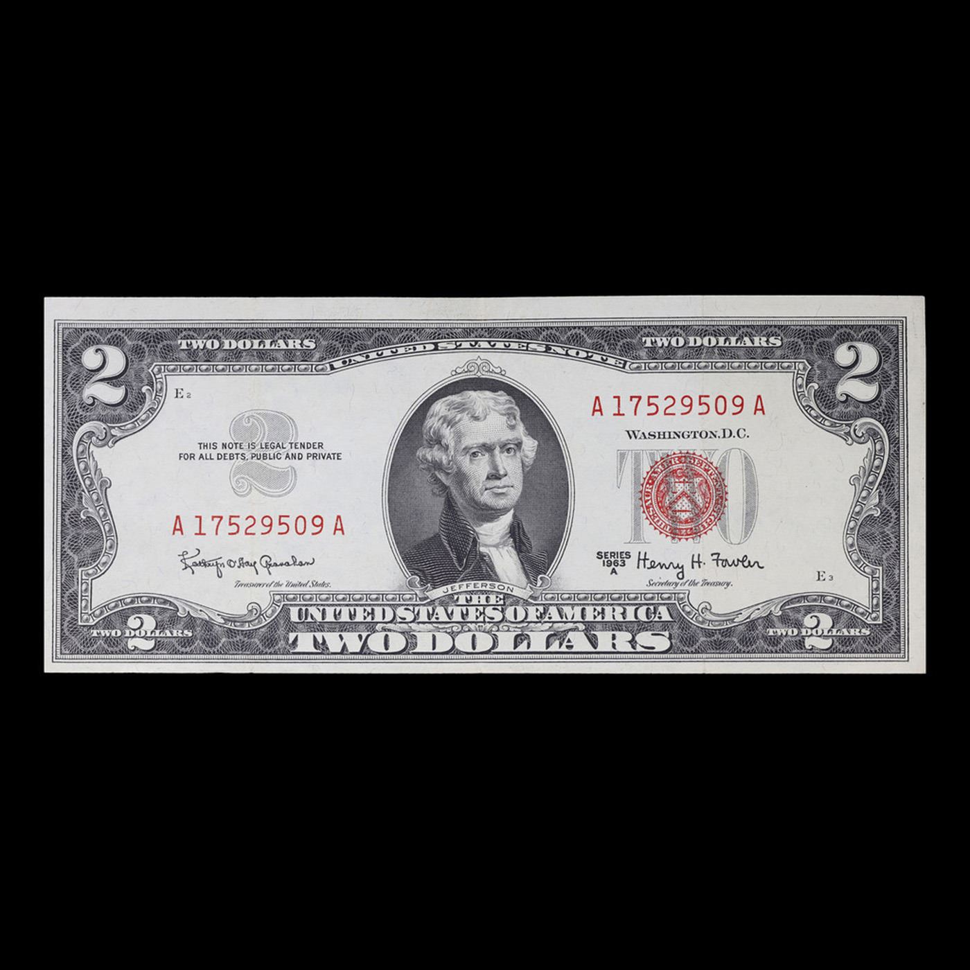1963A $2 Red seal United States Note Grades Choice AU. 1963 Legal Tender (United States Note). 1963 marks the last year that red seals were printed on two dollar bills. This is also the last year that Monticello was used on the back of two dollar bills. All two dollar bills from 1963 have a red seal on the right hand side of the bank note.
