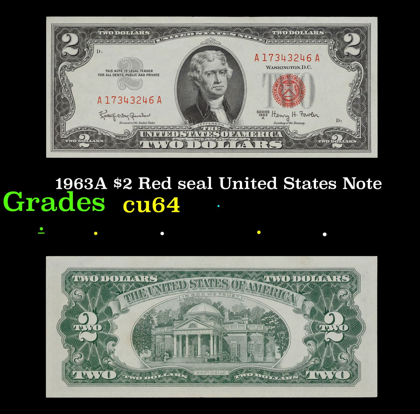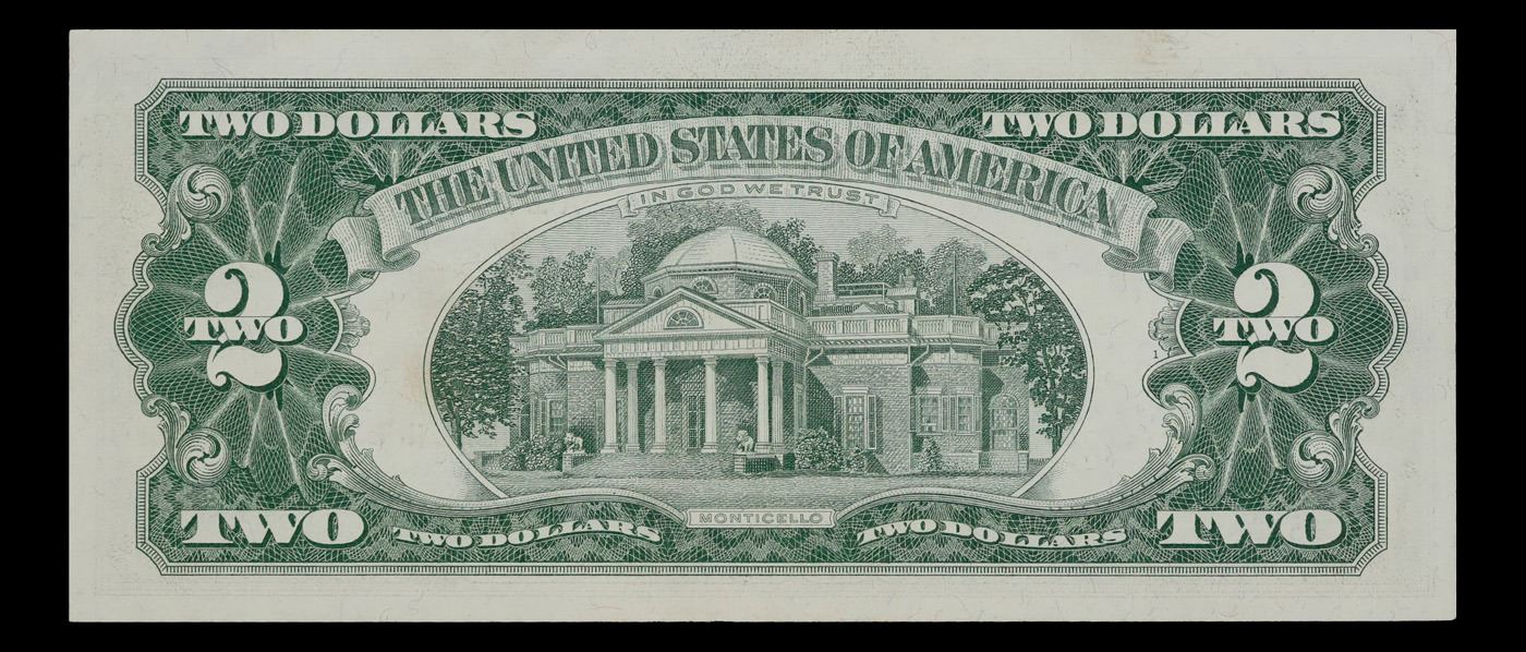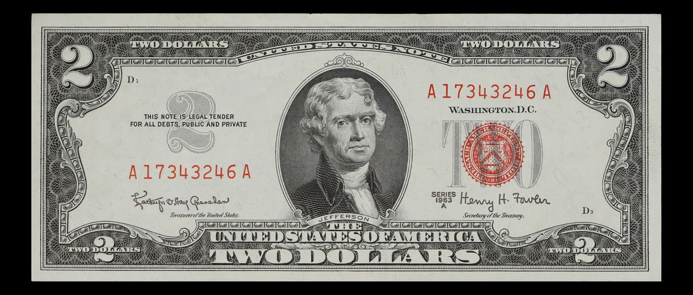 1963A $2 Red seal United States Note Grades Choice CU. 1963 Legal Tender (United States Note). 1963 marks the last year that red seals were printed on two dollar bills. This is also the last year that Monticello was used on the back of two dollar bills. All two dollar bills from 1963 have a red seal on the right hand side of the bank note.