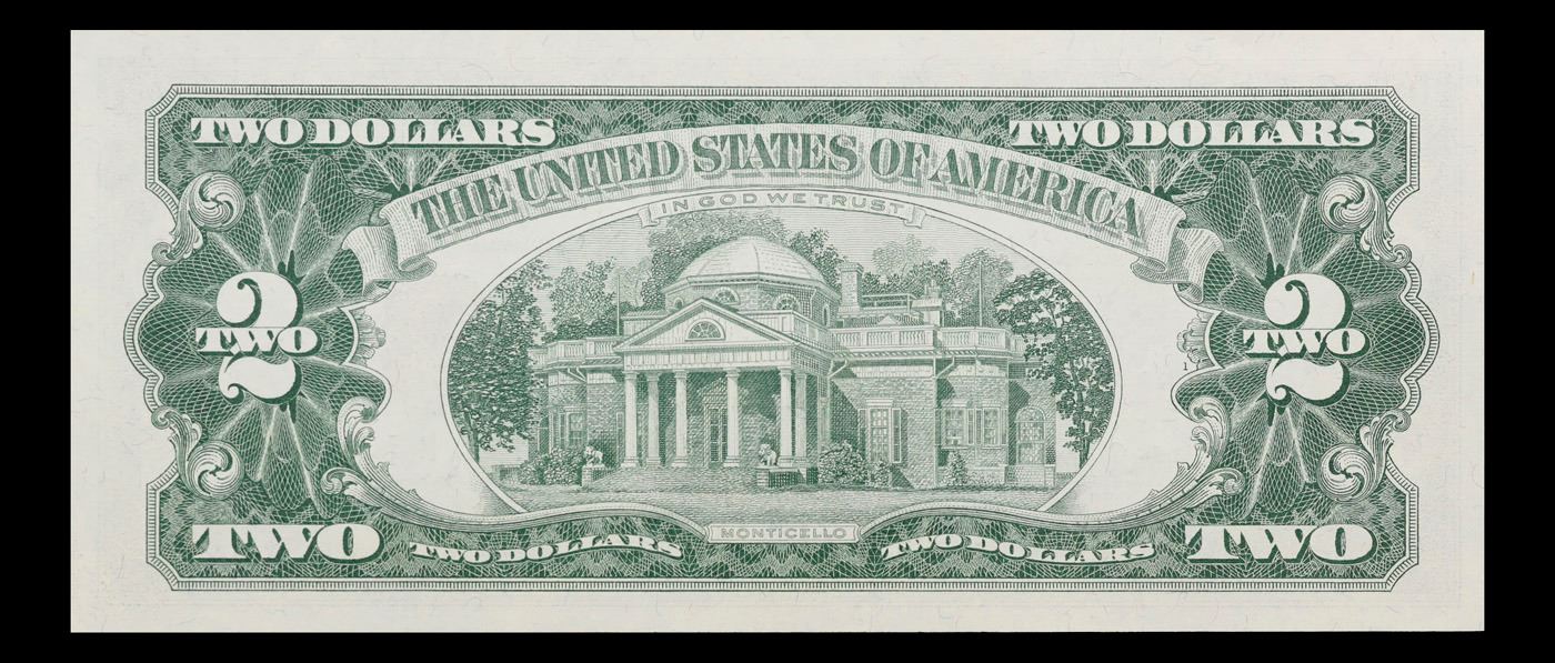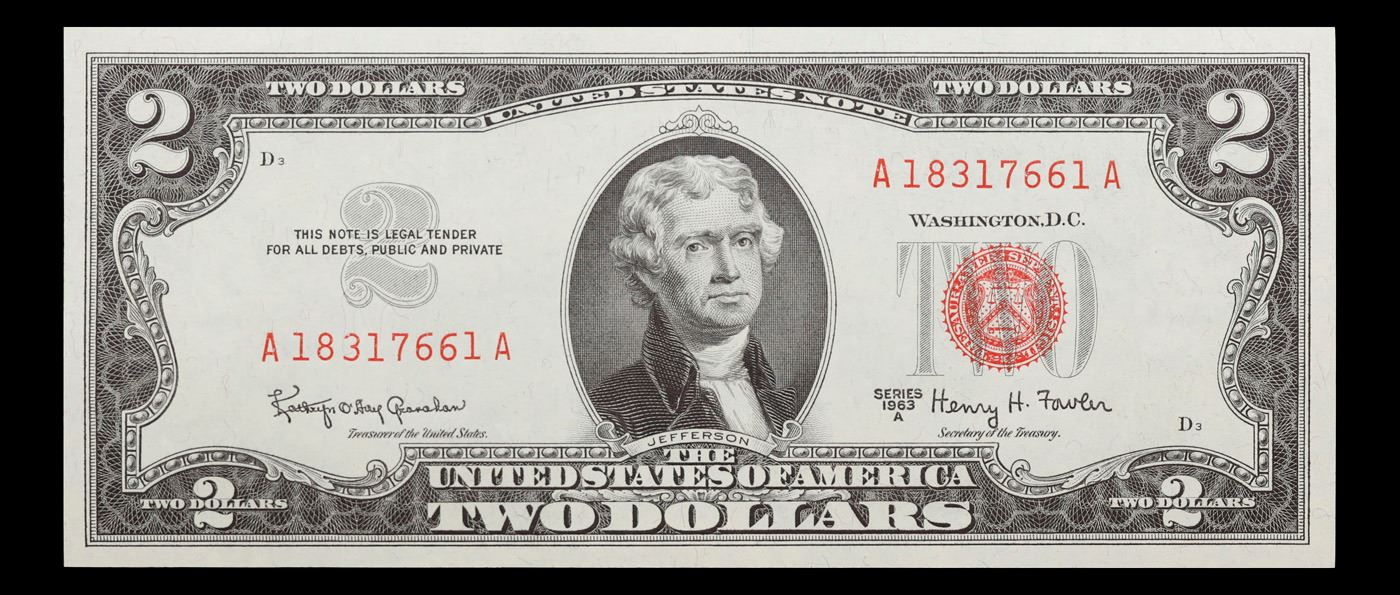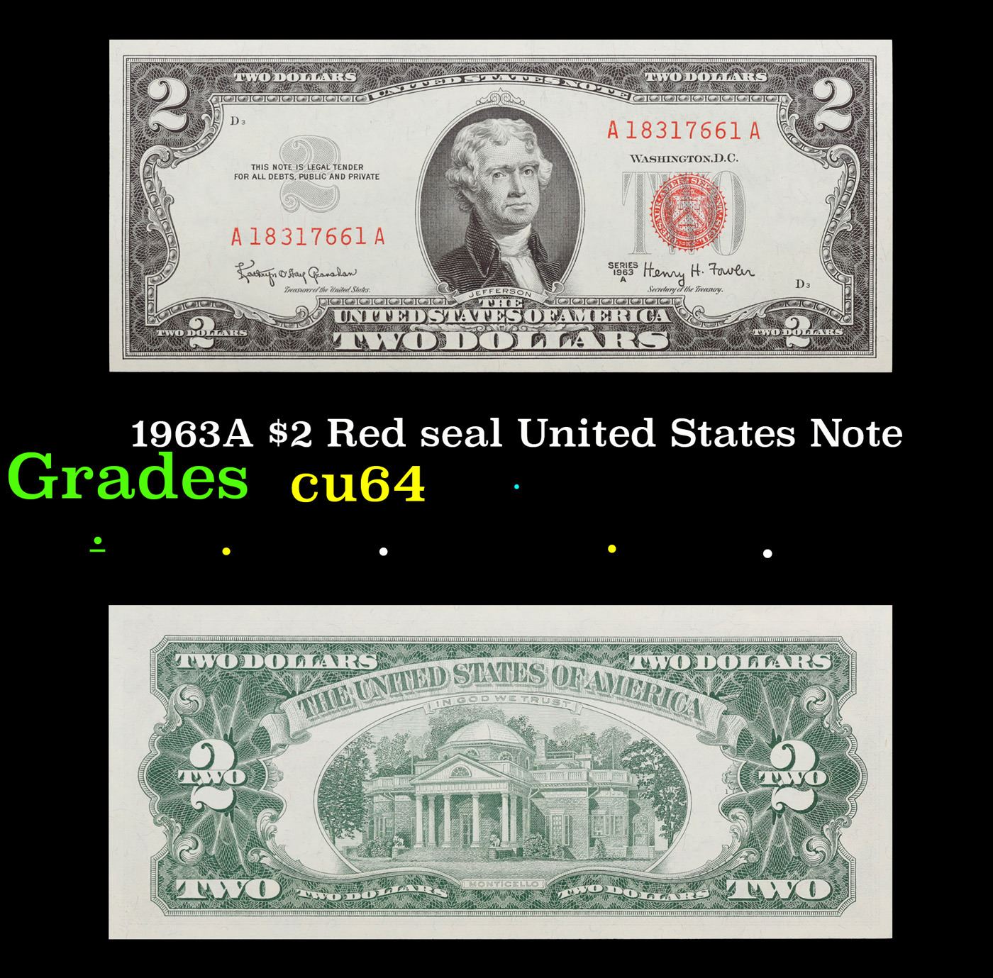 1963A $2 Red seal United States Note Grades Choice CU. 1963 Legal Tender (United States Note). 1963 marks the last year that red seals were printed on two dollar bills. This is also the last year that Monticello was used on the back of two dollar bills. All two dollar bills from 1963 have a red seal on the right hand side of the bank note.