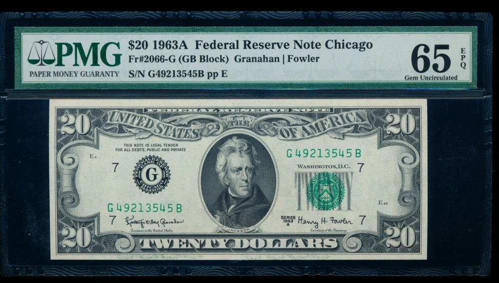 One 1963A $20 Chicago FRN PMG 65EPQ.