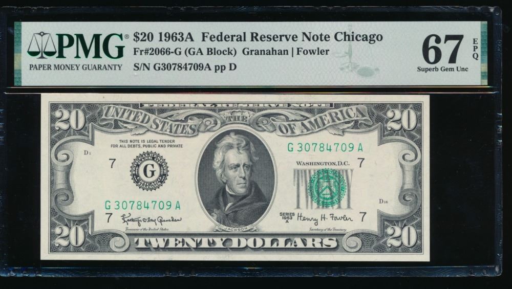 One 1963A $20 Chicago FRN PMG 67EPQ.
