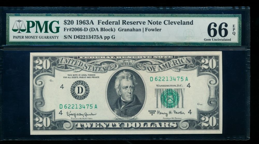 One 1963A $20 Cleveland FRN PMG 66EPQ.