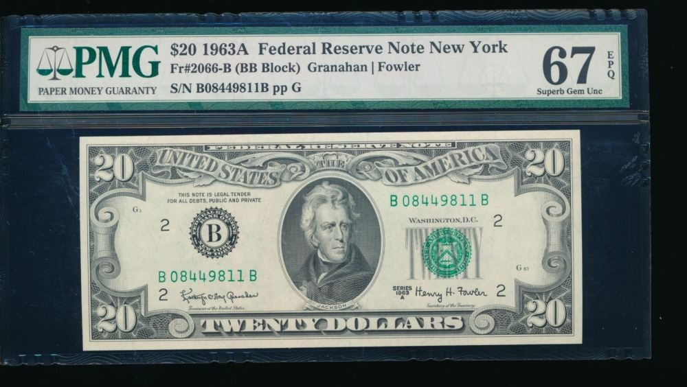 One 1963A $20 New York Federal Reserve Note PMG 67EPQ.