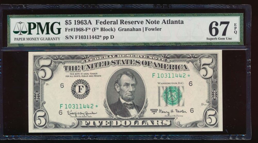 One 1963A $5 Atlanta Federal Reserve Star Note PMG 67EPQ.