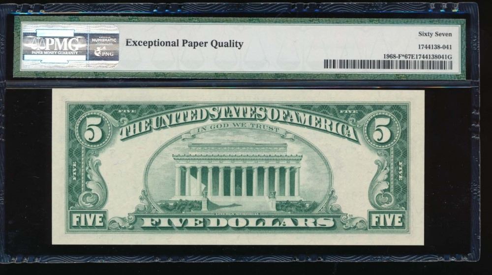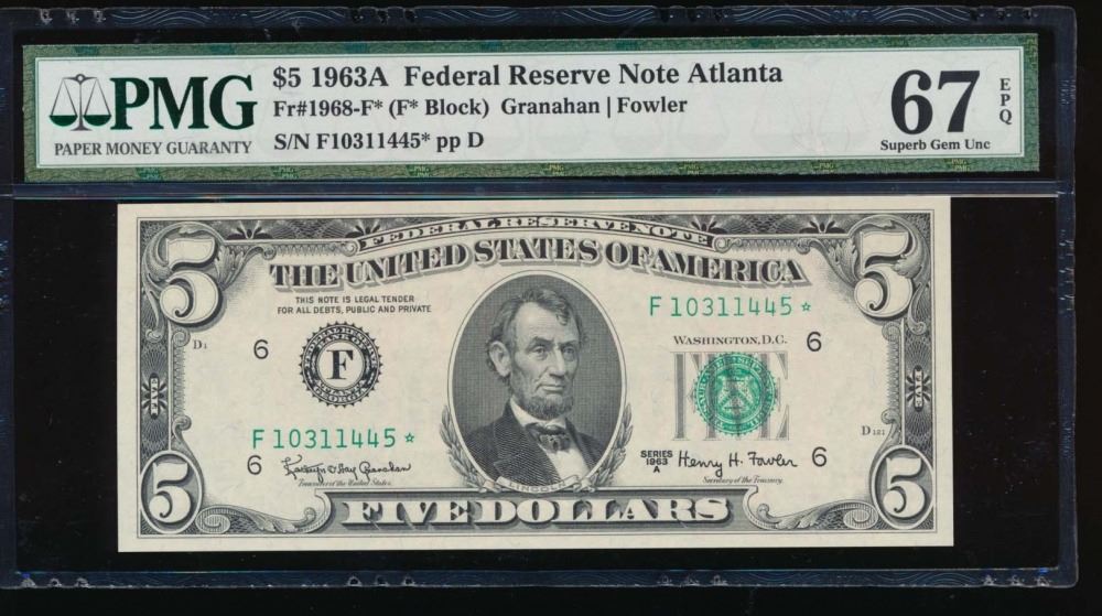 One 1963A $5 Atlanta Federal Reserve Star Note PMG 67EPQ.