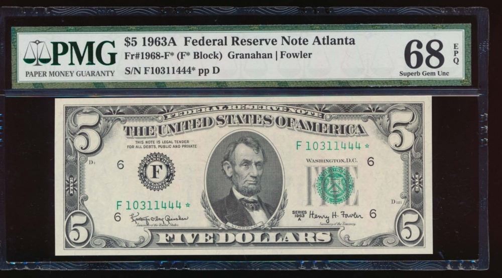 One 1963A $5 Atlanta Federal Reserve Star Note PMG 68EPQ.